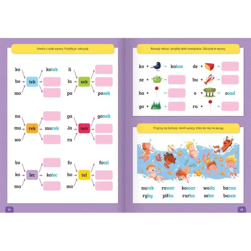 - Forma: zadania sylabowe, łamigłówki, naklejki