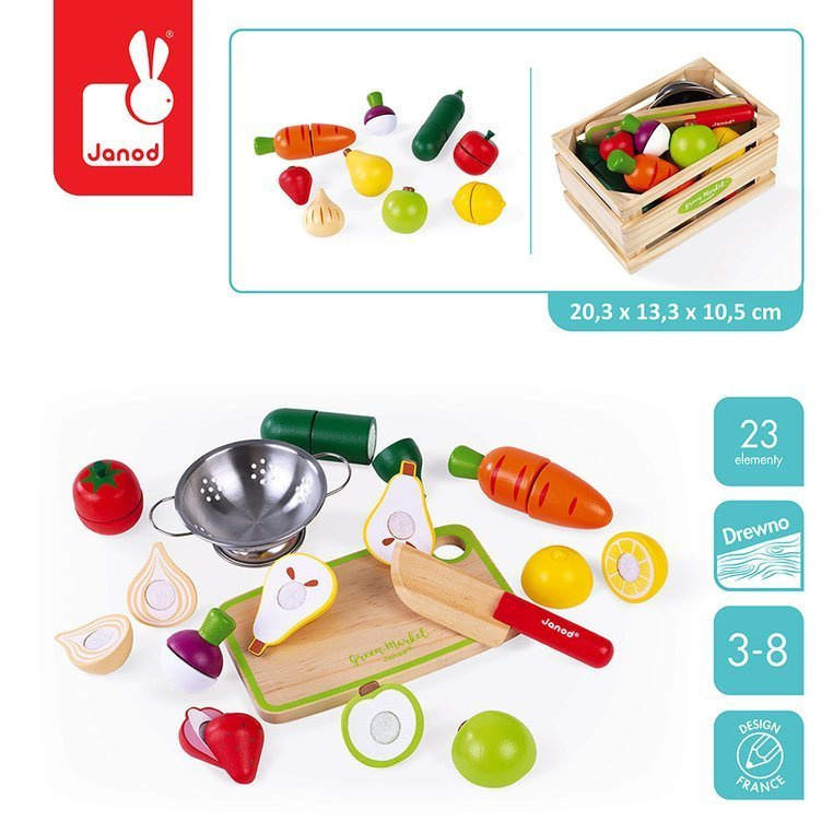 Drewniana skrzynka z warzywami i owocami z kolekcji Green Market francuskiej marki JANOD to zabawka, która wspomaga rozwój dziecka na wielu płaszczyznach: ćwiczy zdolności manualne, uczy cierpliwości oraz koncentracji, rozwija wyobraźnię i umiejętności społeczne. W skład zestawu wchodzą: spora skrzynka, deska do krojenia, nóż, metalowy cedzak, 8 2-częściowych warzyw i owoców, tj. cebula, cytryna, pomidor, jabłko, marchewka, gruszka, truskawka i rzodkiewka oraz 3-częściowy ogórek. Każdy owoc i warzywo można pokroić drewnianym nożem, a potem znów ze sobą połączyć, na rzepy. Zestaw oferuje wiele opcji zabawy, np. w gotowanie lub warzywniak. Może się nim też bawić więcej niż jedno dziecko jednocześnie. Elementy wykonane z drewna pomalowano bezpiecznymi dla dzieci farbami. Wszystkie akcesoria są precyzyjne i estetyczne.