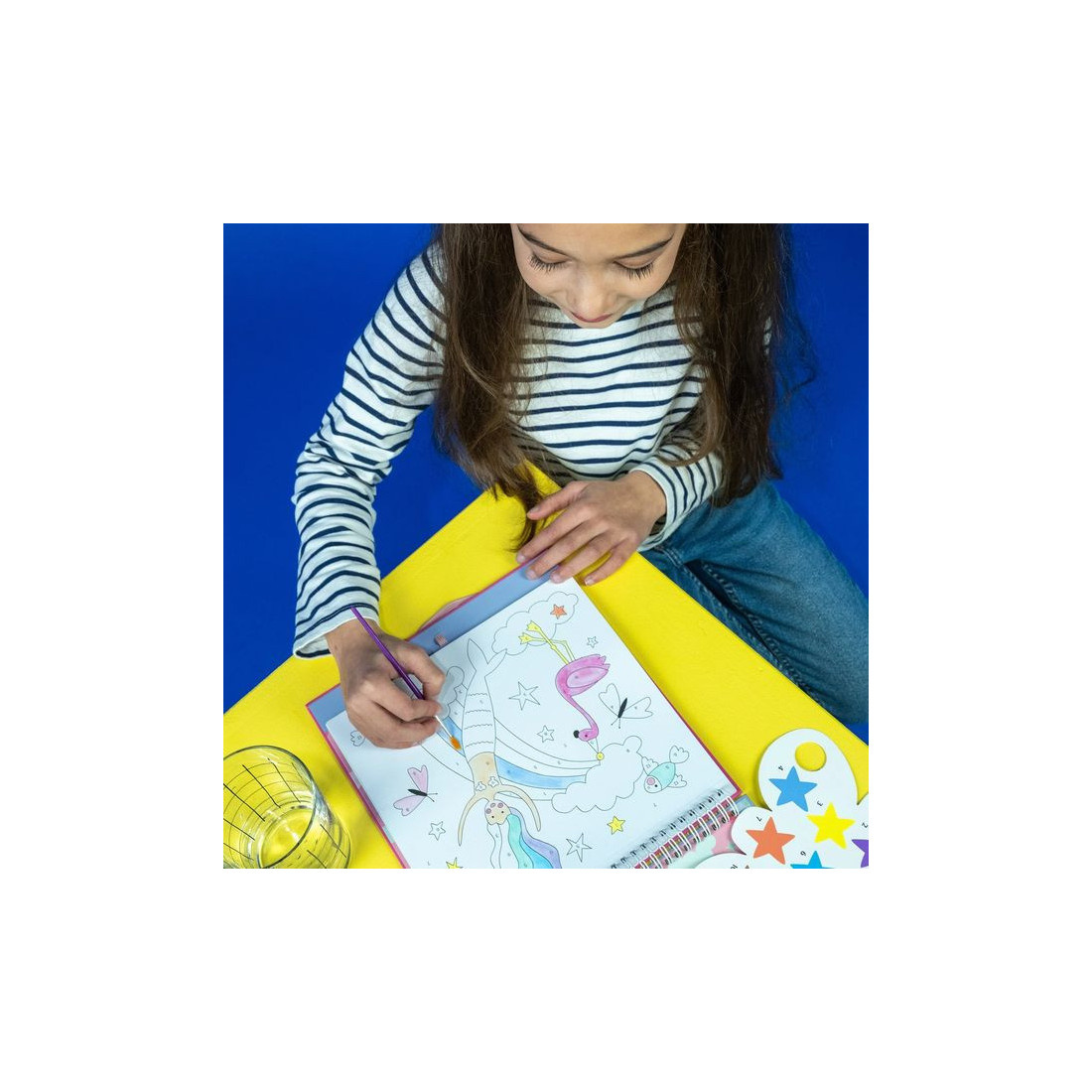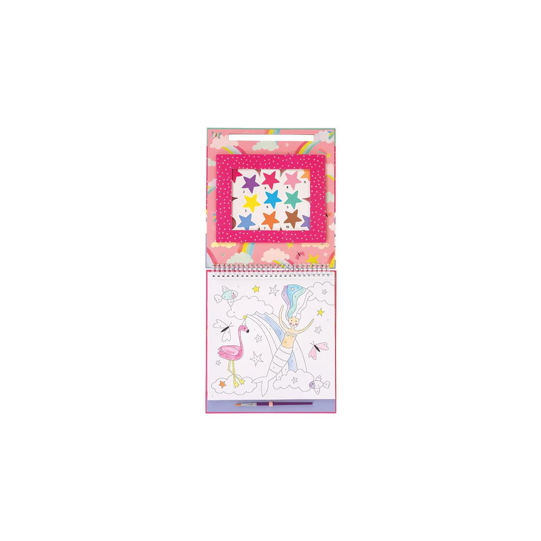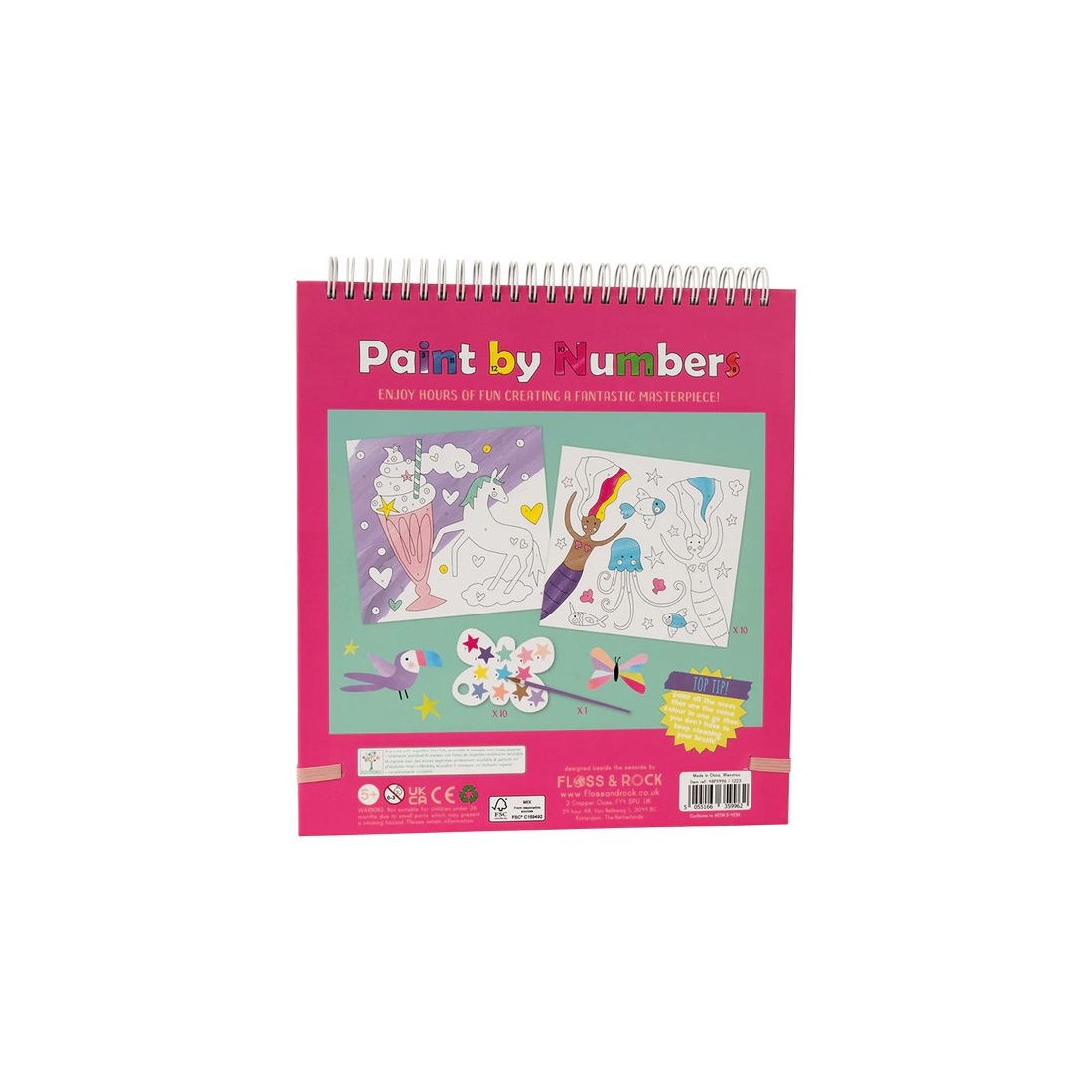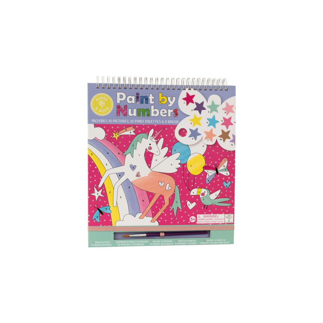W zestawie znajduje się 10 kart z wyjątkowymi ilustracjami do malowania, każda z dedykowaną paletą farbek w różnych kształtach oraz poręczny pędzelek. Karty są oprawione spiralnie, co ułatwia korzystanie z nich w domu i w podróży. Po zakończeniu zabawy można je łatwo wyrwać i wyeksponować w ramce. Elastyczna gumka trzyma pędzelek na miejscu, a całość zamyka się jak książka, bez ryzyka bałaganu.