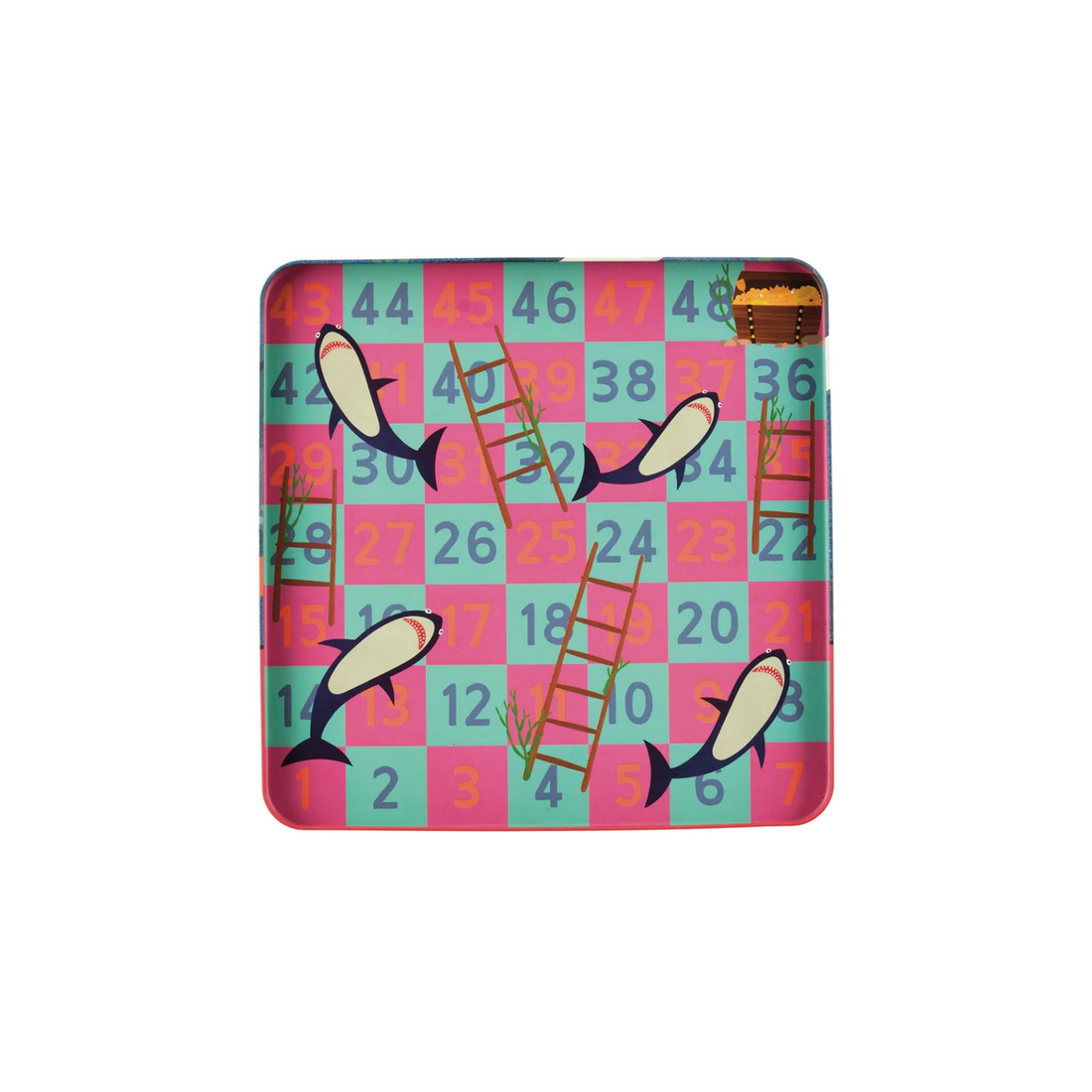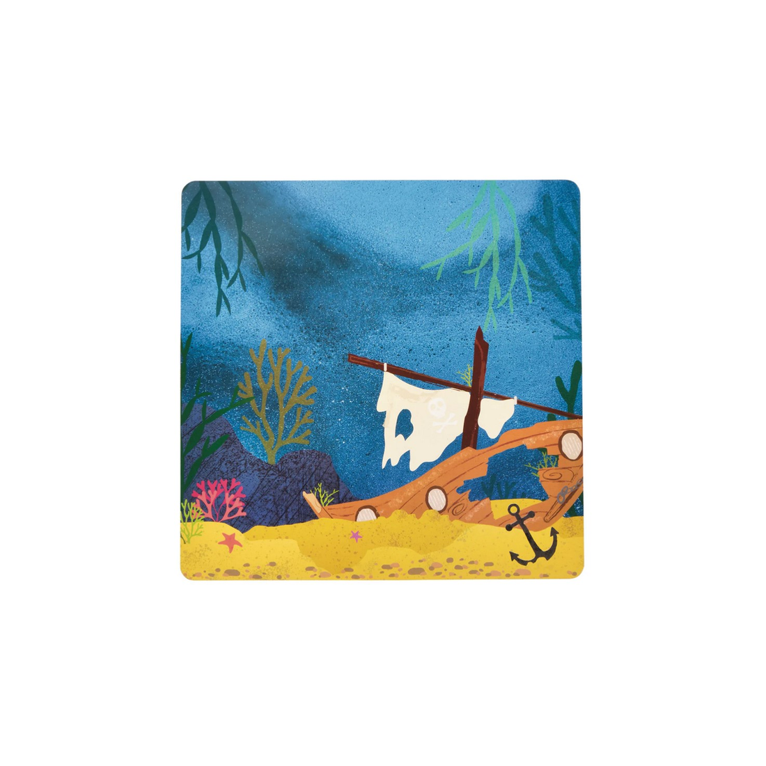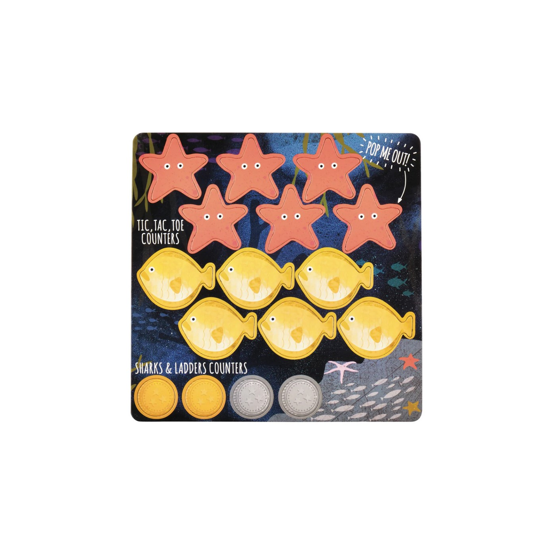 Wśród gier znajdziemy klasyczną planszówkę, w której gracze wspinają się po drabinach w poszukiwaniu pirackiego skarbu – lub napotykają rekina i spadają na dół! Zestaw zawiera także kółko i krzyżyk, magnetyczną planszę do wyszukiwania słów oraz kreatywną mapę do odkrywania morskich głębin i ich mieszkańców.