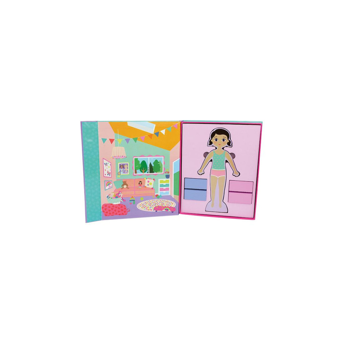 W zestawie znajdziesz dwie drewniane lalki ze stojakami oraz ponad 70 magnetycznych elementów garderoby i akcesoriów. Dzięki nim można tworzyć niezliczone stylizacje i scenki. Po lewej stronie praktycznego pudełka znajduje się magnetyczna plansza, idealna do zabawy w ubieranie postaci. Wszystko przechowywane jest w poręcznym, zamykanym pudełku, co czyni ten zestaw świetnym rozwiązaniem zarówno w domu, jak i w podróży.