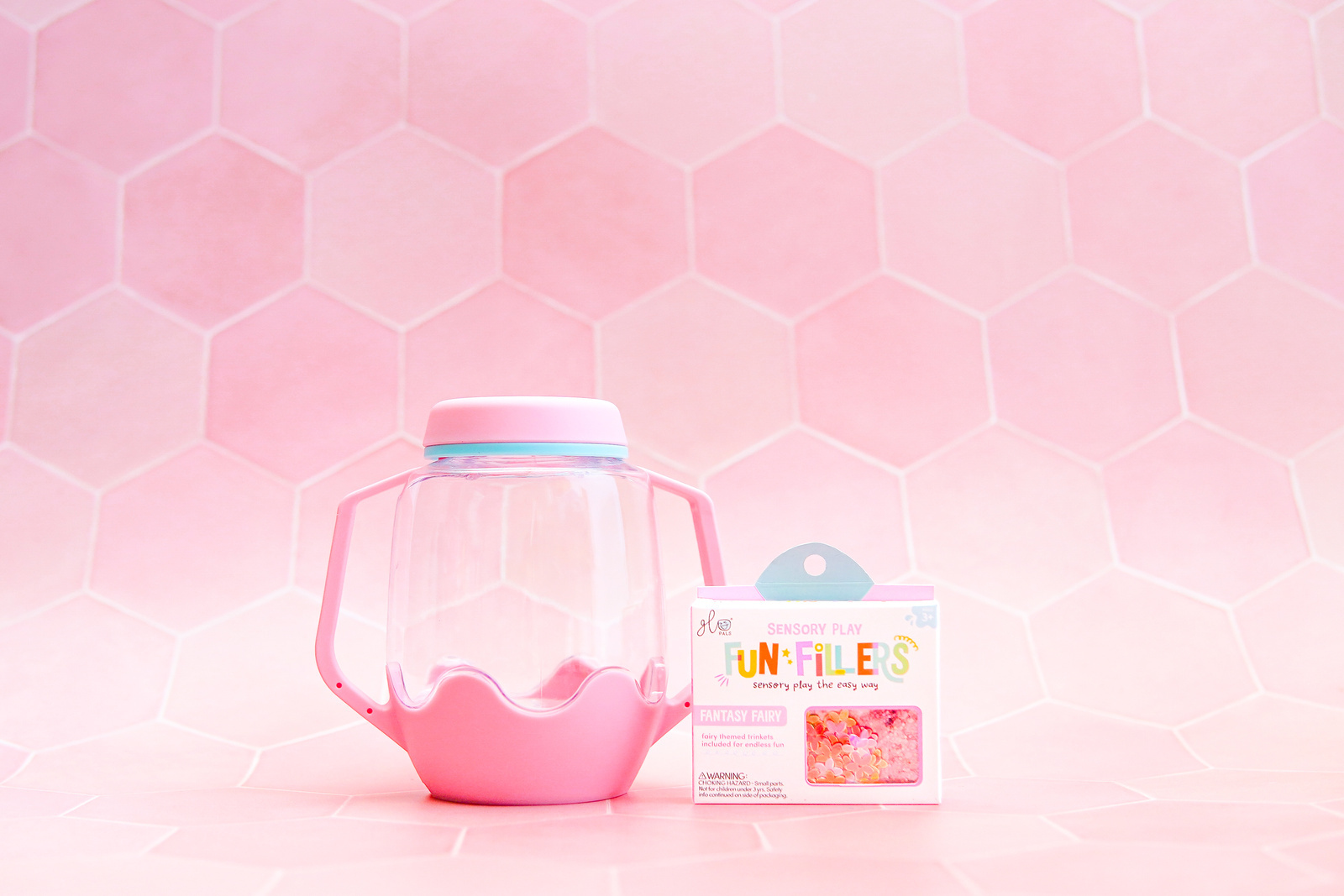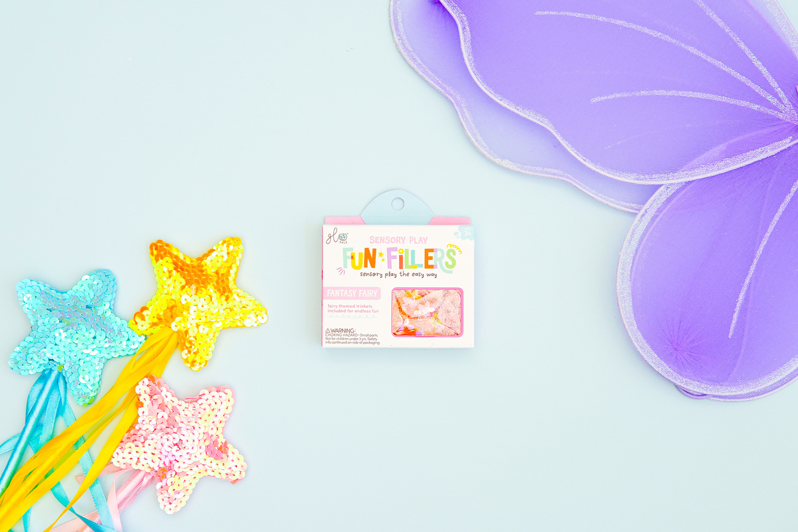 FAIRY Fun Fillers to zestaw pełen blasku, pastelowych kolorów i delikatnych detali, który pozwala dziecku stworzyć własny, zaczarowany świat w słoiku sensorycznym Glo Pals lub w dowolnej sensorycznej misie. To szybki i efektowny sposób, aby dodać zabawie magii, światła i twórczej inspiracji.