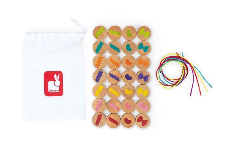 Gra pamięciowa Pasta mania francuskiej marki JANOD to wspaniała zabawa zarówno dla dzieci, jak i rodziców (od 2 do 4 osób). W skład zestawu wchodzi 28 dwustronnych drewnianych żetonów z ilustracjami makaronów i dziurkami do nawlekania, 4 długie sznurki w różnych kolorach (żółtym, czerwonym, fioletowym i niebieskim) i 1 materiałowy woreczek. Celem gry jest skompletowanie naszyjnika z 5 żetonów-makaronów w takim samym kolorze lub kształcie. Gracz, który zrobi to jako pierwszy – wygrywa. Gra ta trenuje pamięć i koncentrację, spostrzegawczość i cierpliwość.