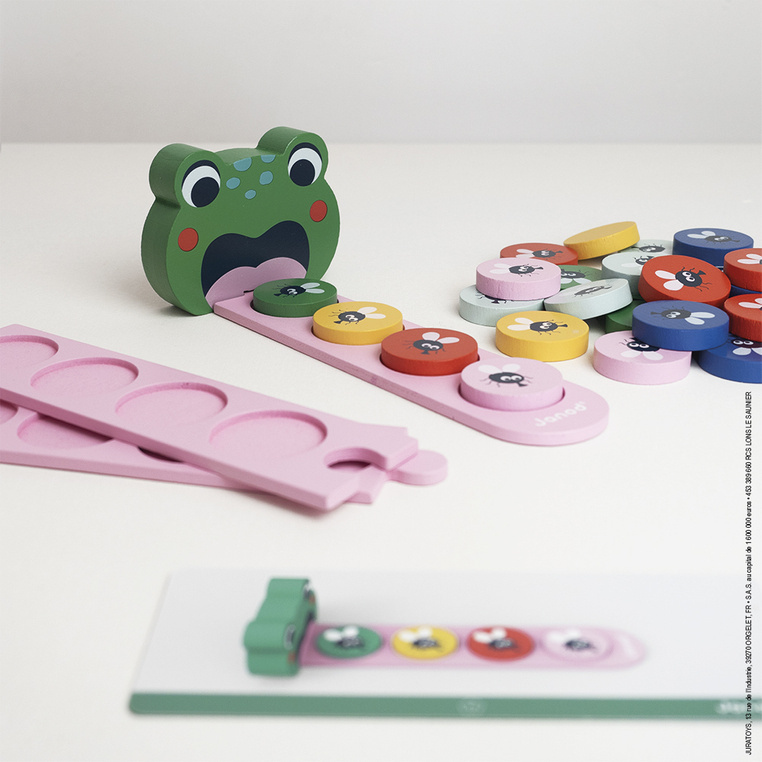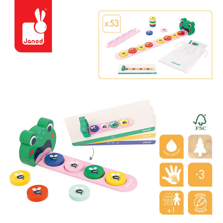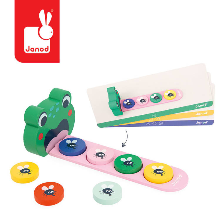 Układanka Algorytmy Żaba marki Janod to wyjątkowa zabawka edukacyjna dla dzieci od 3. roku życia, która w przystępny i atrakcyjny sposób uczy logicznego myślenia. Zadaniem dziecka jest odtworzenie sekwencji kolorowych much zgodnie z wzorami pokazanymi na kartach – od prostych układów po coraz bardziej złożone algorytmy.