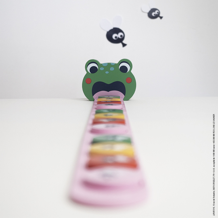 Zestaw składa się z drewnianej głowy żaby oraz trzech modułowych podstawek tworzących jej język. Wraz ze wzrostem umiejętności dziecka elementy języka można łączyć, budując coraz dłuższe ciągi logiczne. To idealna zabawka z kategorii zabawki edukacyjne, która łączy naukę z radością odkrywania.