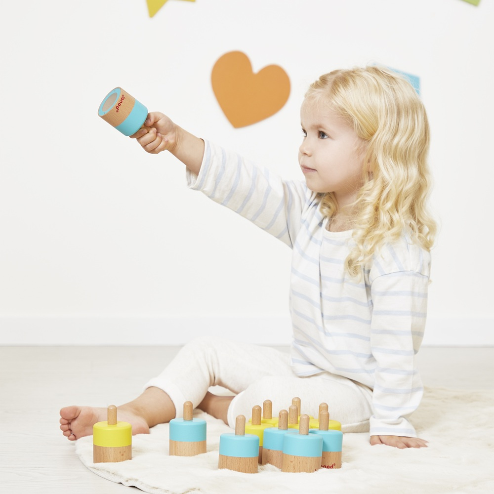 W zestawie znajduje się 6 par drewnianych grzechotek – każda wypełniona innym materiałem, dzięki czemu wydaje odmienny dźwięk. Zadanie dziecka polega na dopasowaniu par wyłącznie na podstawie słuchu, co jest nie tylko fascynujące, ale też świetnie wspiera rozwój.