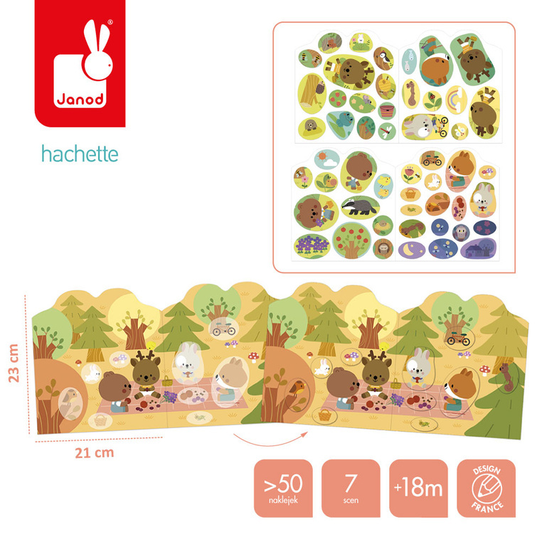 Każda ze stron książeczki to inna scena z życia w lesie, pełna pustych miejsc do uzupełnienia. Dzięki temu dziecko może projektować własne historie, śledzić losy leśnych bohaterów i rozwijać swoją wyobraźnię. Książeczka została zaprojektowana we Francji we współpracy z wydawnictwem Hachette, co gwarantuje wysoką jakość wykonania oraz wyjątkową estetykę.