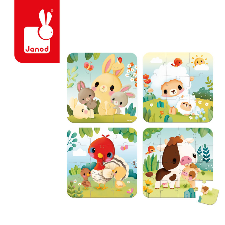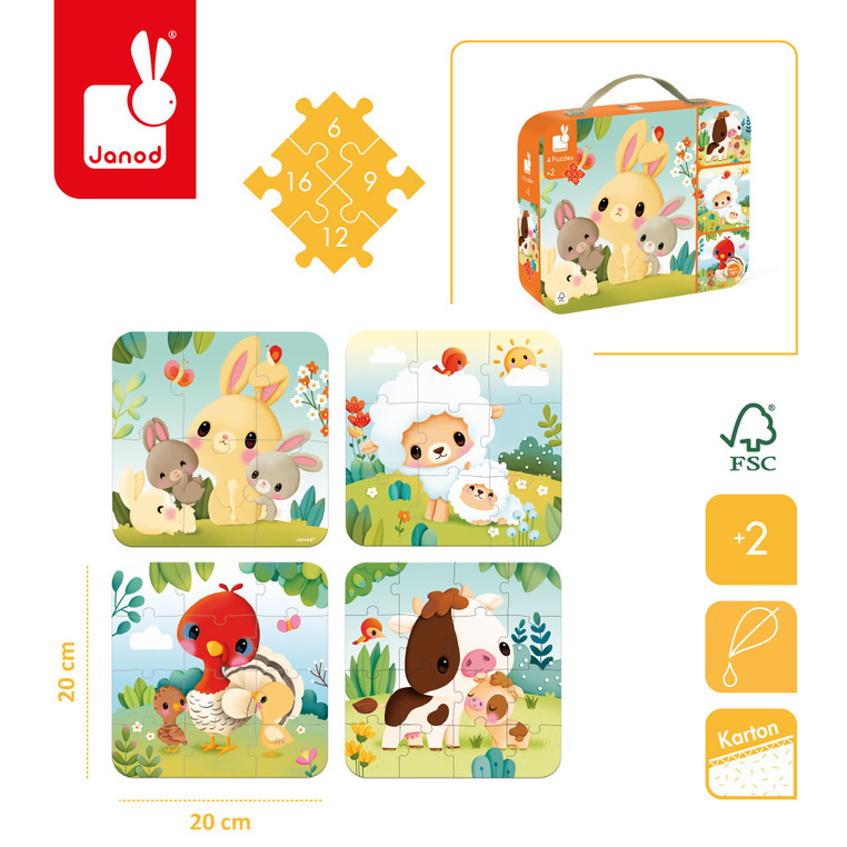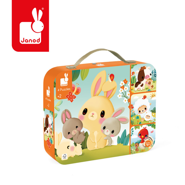 Janod Puzzle progresywne Zwierzątka na farmie w walizce – 4 układanki 6/9/12/16 elementów 2+