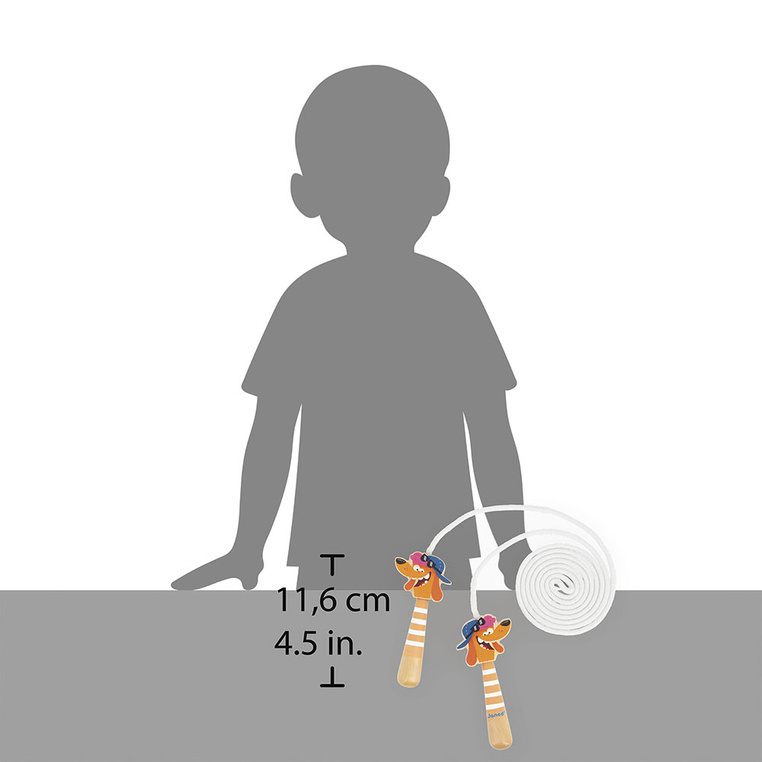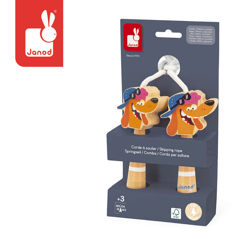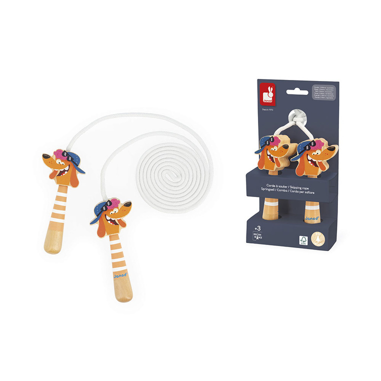 Skakanka z drewnianymi rączkami Piesek z kolekcji Applepop marki Janod to doskonała zabawka sportowa, która zachęca dzieci do aktywności na świeżym powietrzu. Miękki, biały sznurek ma długość 2 metrów (można go skrócić według potrzeby), a drewniane rączki ozdobione są uroczymi pieskami. Rączki mają wydłużony kształt, co ułatwia trzymanie skakanki przez małe rączki dzieci.