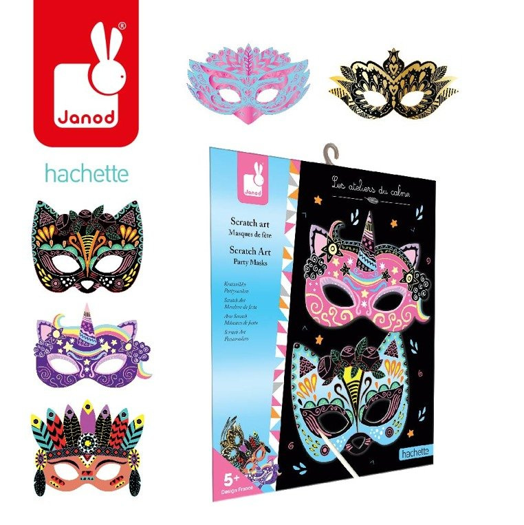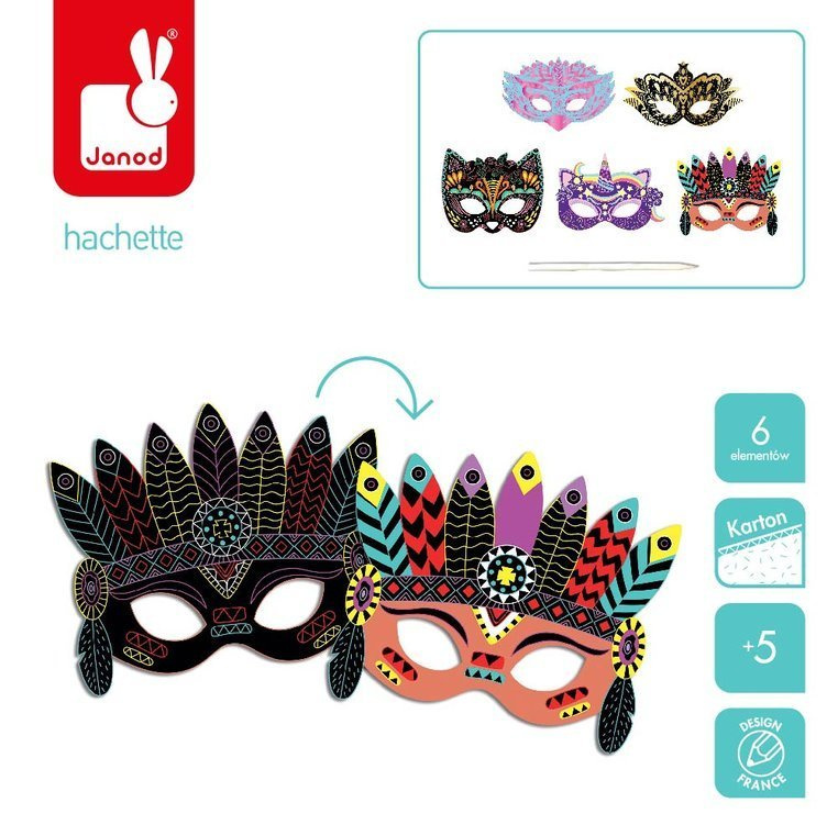Zestaw kreatywny Do zdrapywania Maski karnawałowe francuskiej marki JANOD zawiera 5 masek z solidnego kartonu – indiańską, wenecką, indyjskiego kota, sowy oraz jednorożca. Maski są czarne, jedynie z kolorowymi konturami elementów, które ukazują się stopniowo w efekcie zdrapywania wierzchniej warstwy. Do zestawu dołączony jest plastikowy patyczek do zdrapywania. Zdrapywanie to dla dziecka długie godziny angażującej i jednocześnie uspokajającej, wyciszającej zabawy, a gotowe maski można nosić jako przebranie lub zrobić z nich wspaniałą dekorację dziecięcego pokoju. Zestaw zaprojektowano we Francji we współpracy z francuską grupą mediową i wydawniczą Hachette. Zapakowany jest w stylowe kartonowe pudełko. Idealnie nadaje się na prezent.