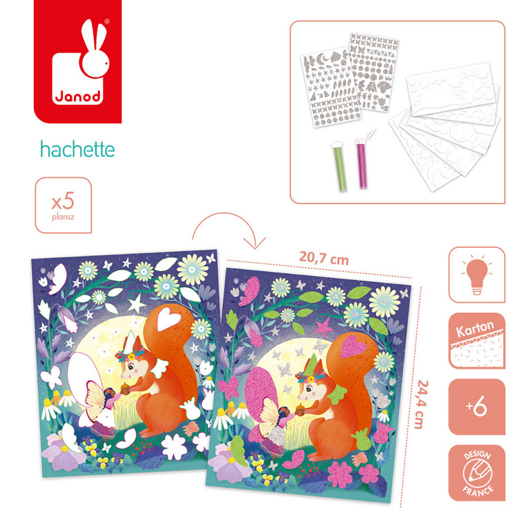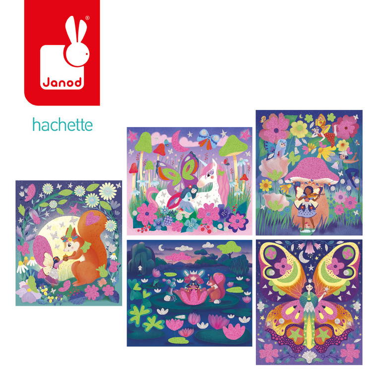Odkryj zaczarowany las wróżek z kreatywnym zestawem JANOD – Magiczny świat wróżek. To wyjątkowa propozycja dla małych artystów od 6. roku życia, która pozwala tworzyć magiczne ilustracje z pomocą fluorescencyjnego piasku i piankowych naklejek. W zestawie znajduje się 5 plansz-obrazków przedstawiających urocze wróżki w ich fantazyjnym świecie oraz wszystkie potrzebne materiały do ich ozdabiania.