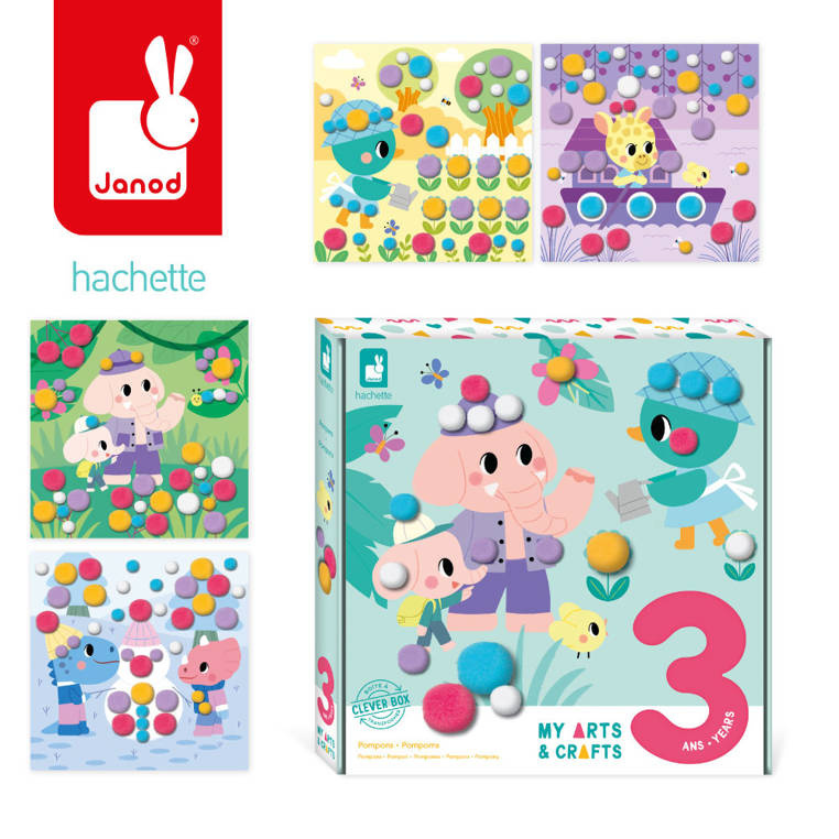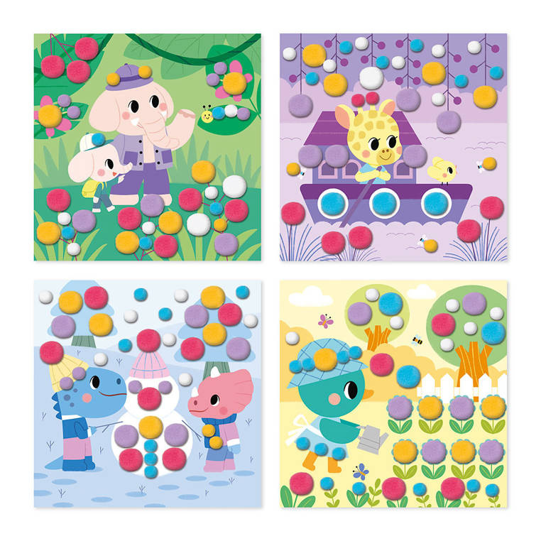 Zestaw kreatywny Pompony z serii My arts & crafts francuskiej marki JANOD to wspaniała zabawa manualna dla najmłodszych twórców. W komplecie znajdują się 4 plansze-obrazki przedstawiające zwierzątka w zabawnych sytuacjach, takich jak: żyrafy na łódce, kaczuszka z konewką, dinozaury lepiące bałwana czy słonie na spacerze. Dziecko ozdabia je, naklejając w wyznaczonych miejscach kolorowe pompony – aż 150 sztuk w dwóch rozmiarach i pięciu kolorach.