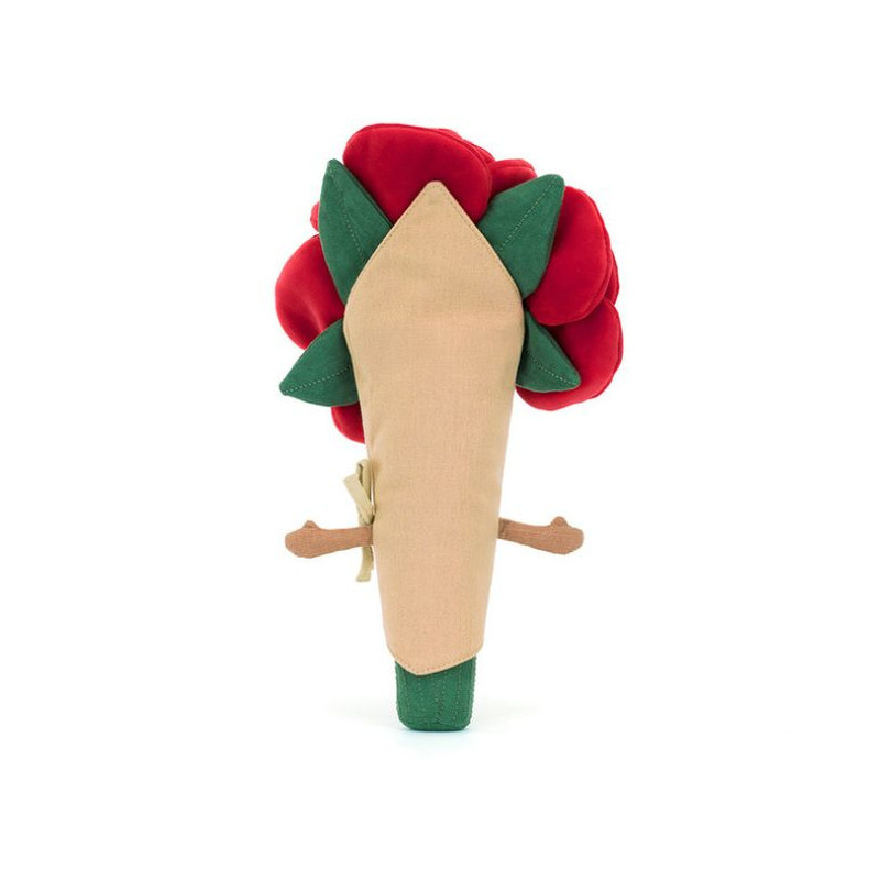 Wesoły Bukiet Róż 30 cm to wyjątkowa, mięciutka przytulanka Jellycat, która łączy urok kwiatowego bukietu z ciepłem klasycznego pluszaka. Puszyste, czerwone róże z zielonymi listkami zostały „owinięte” w lniany materiał, zawiązane wstążką i ozdobione delikatnym, haftowanym uśmiechem. To zabawna, niepowtarzalna propozycja, która wywołuje radość zarówno u najmłodszych, jak i starszych dzieci.