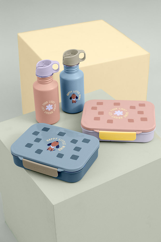 Lunchbox utrzymany jest w optymistycznym niebieskim kolorze i ozdobiony grafiką radosnego brązowego pieska z napisem HAPPY LITTLE MIND. Beżowy klips wieńczący pudełko dodaje całości spójnego charakteru. Wzór idealnie wpisuje się w kolekcję Pattern Party, która łączy modny design z dziecięcą radością.
