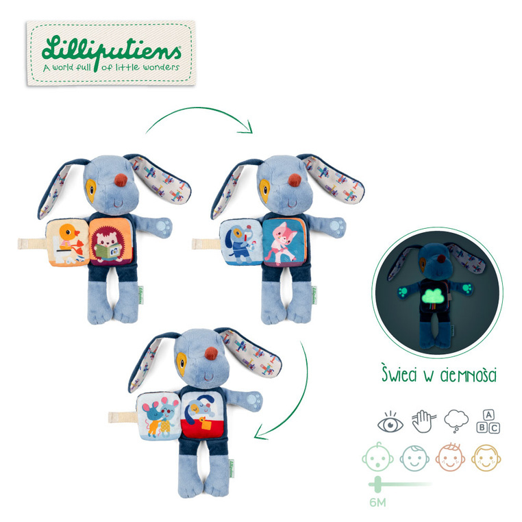 Świetnym uzupełnieniem będą inne przytulanki i zabawki sensoryczne od Lilliputiens, dopasowane do wieku dziecka: 0–6 miesięcy, 6–12 miesięcy i 12 miesięcy +.
