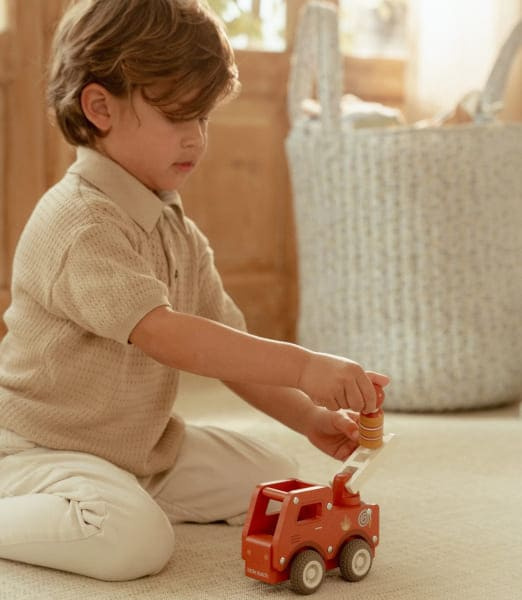 Wiek: od 12 miesięcy | Zawartość: auto strażackie + wyjmowany ludzik | Materiał: drewno FSC® | Zgodność: EN-71
