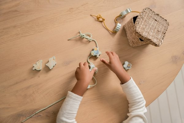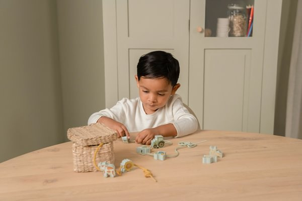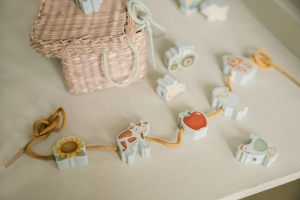 Dziecko może nawlekać figurki przedstawiające zwierzątka, traktor czy stodołę, ćwicząc przy tym koordynację ręka-oko, cierpliwość oraz motorykę małą. Zabawa nawlekanką nie tylko rozwija umiejętności manualne, ale także wspiera wyobraźnię i koncentrację.
