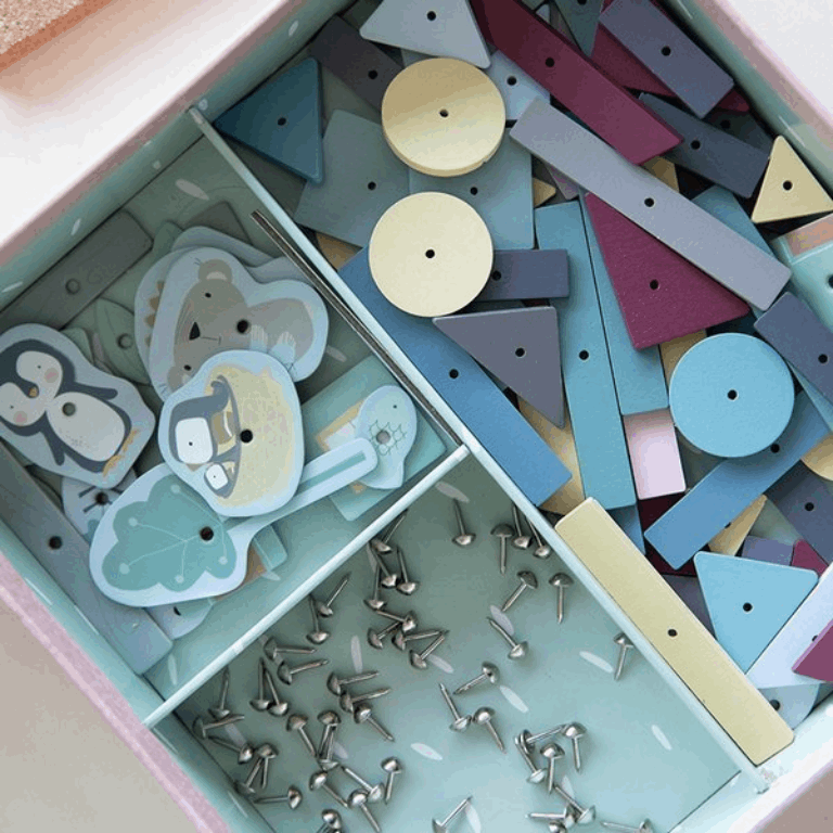 Przybijanka to kultowa zabawka, która zapewni dzieciom długie godziny zabawy. Zestaw zawiera korkową podkładkę, młoteczek, małe gwoździki, kształty geometryczne oraz ilustrowane postacie wykonane z wysokiej jakości tektury, a także karty z przykładowymi wzorami do wykonania.