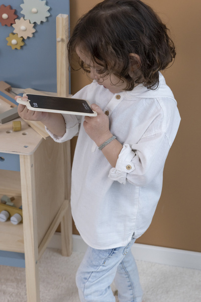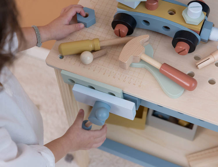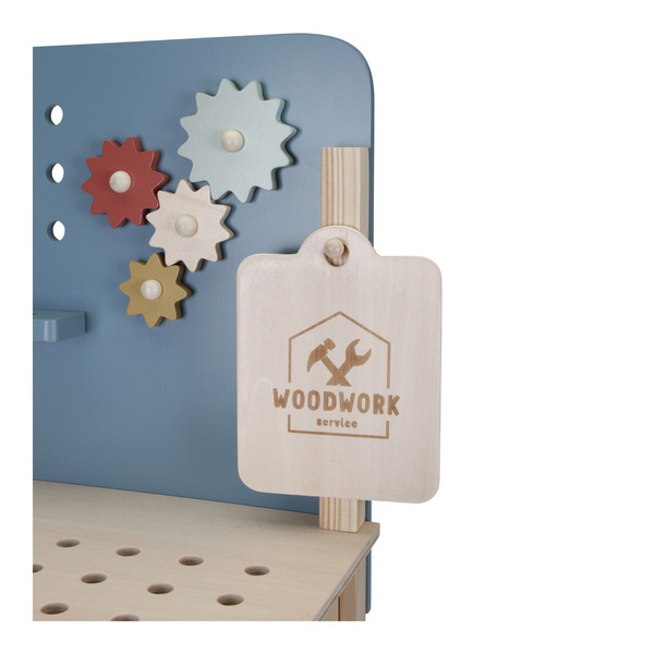 Warsztat z narzędziami to nowa odsłona naszego bestsellera uwielbianego przez dzieci i dorosłych. W zestawie znajdziemy drewniane śrubki, młotek oraz tabliczkę małego majsterkowicza do notowania kredą. Warsztat utrzymany w pięknej, zupełnie nowej kolorystyce, wykonany z drewna z certyfikatem FSC.