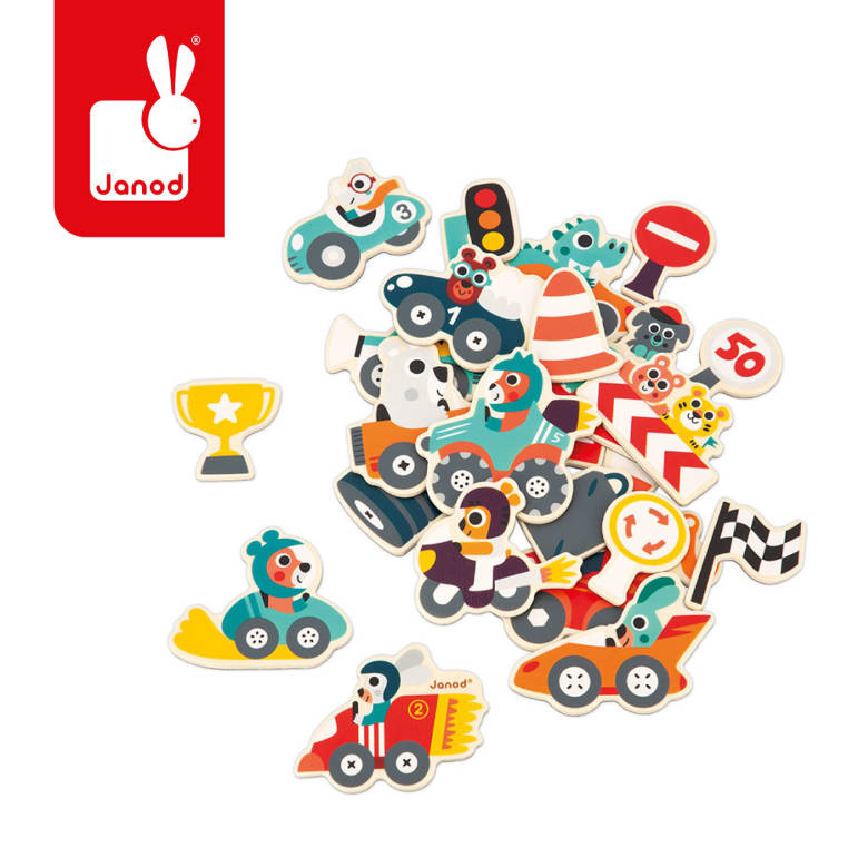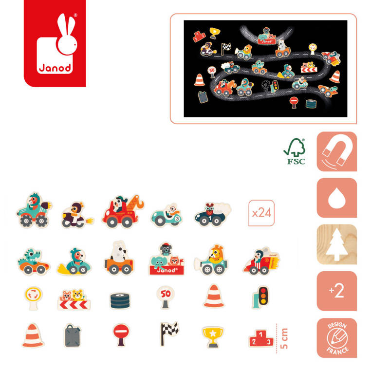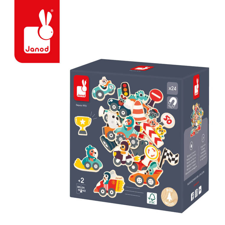 Magnesy Samochody 24 szt. 2+, Janod Zestaw drewnianych magnesów Pojazdy francuskiej marki JANOD to wspaniały prezent dla kilkulatka. Komplet zawiera 24 magnesy o wielkości ok. 5-7 cm, nawiązujące do tematyki wyścigów samochodowych: są tu bolidy, prowadzone przez zwierzęta, holownik, podium, trofeum, opony, kanister, flaga, znaki drogowe, pachołki ostrzegawcze, sygnalizacja świetlna oraz kibice – wszystkie elementy mają ciekawy design i intensywne, energetyzujące barwy. Magnesy te ze względu na jakość wykonania będą służyły przez długie lata, a zabawa nimi od najmłodszych lat rozwija wyobraźnię i zdolności manualne. Zestaw może stanowić uzupełnienie każdej tablicy magnetycznej.