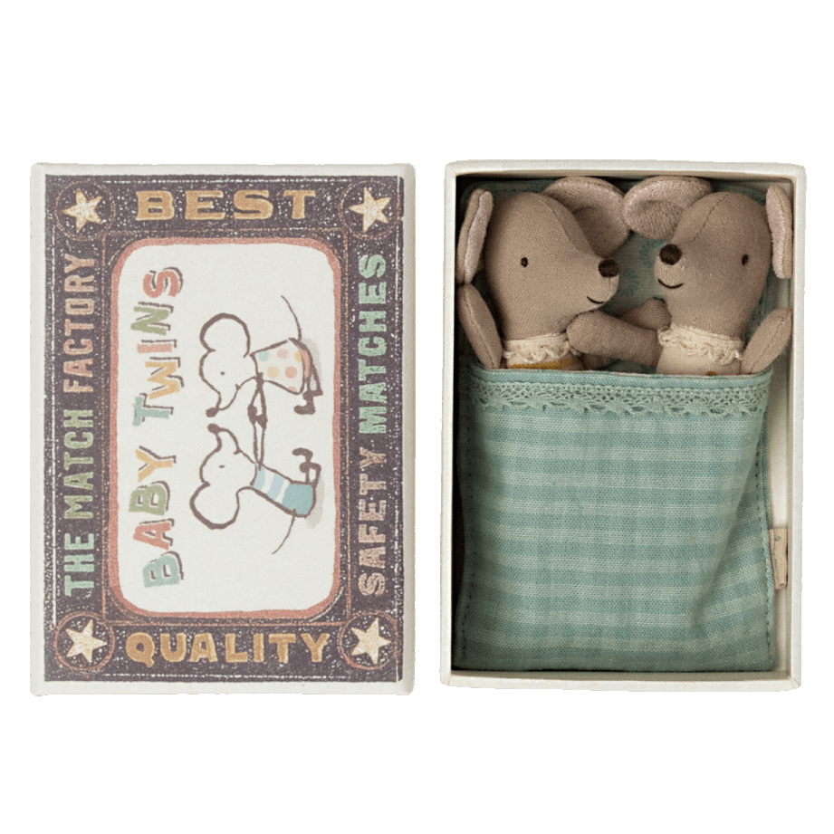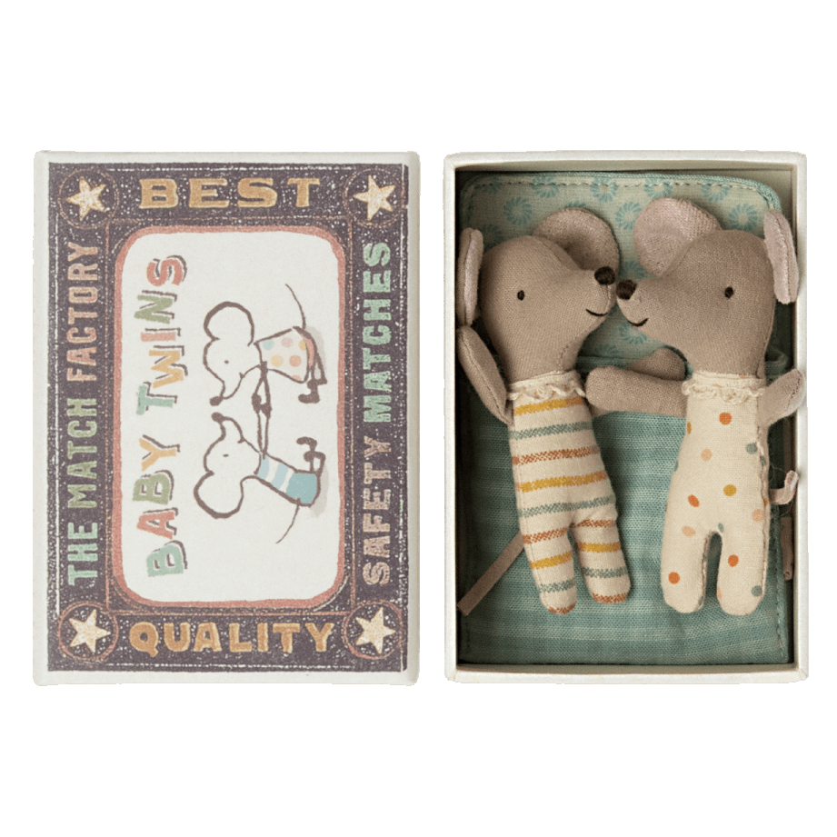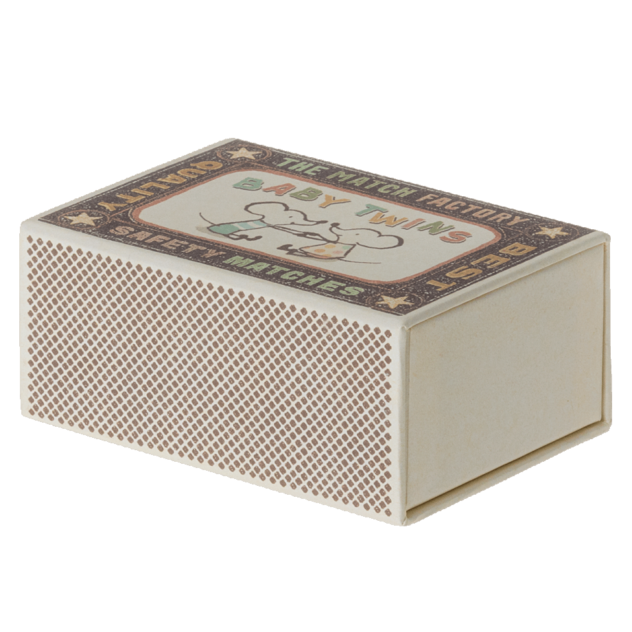Przepiękne myszki kultowej duńskiej marki Maileg, które pokochały dzieci na całym świecie. Myszki zapakowane są w cudowne pudełeczko po zapałkach, stanowiące jednocześnie ich domek. W pudełku wraz z bliźniakami znajduje się zestaw pościeli w ślicznym wzorze.