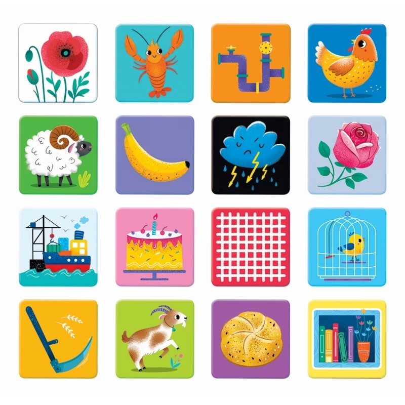 - 32 karty do gry – zestaw dobieranek: obrazki i wyrazy do dopasowania.