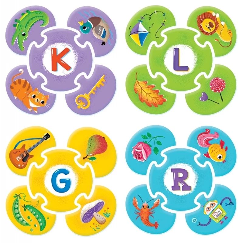 • 4 zestawy układanek – obrazki dopasowywane do określonych głosek.