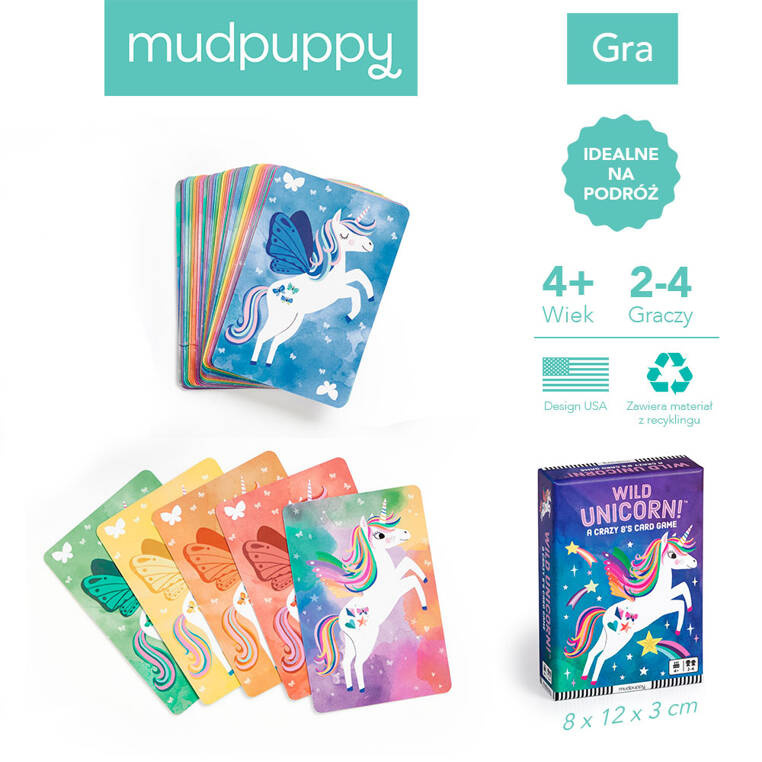 Wild Unicorn! od amerykańskiej marki MUDPUPPY to wyjątkowa gra karciana dla dzieci i całej rodziny, łącząca klasyczne zasady Makao z kolorowymi, magicznymi jednorożcami. Idealna dla dzieci od 4 lat, rozwija planowanie, koncentrację i pamięć poprzez zabawę.