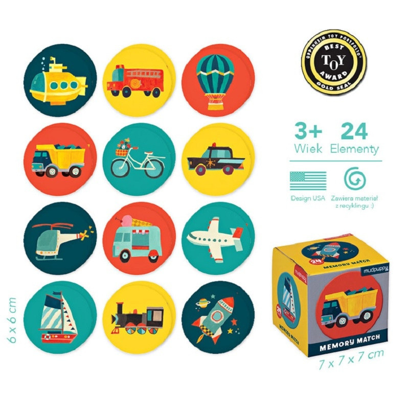 Gra Mini Memory Środki transportu składa się z 12 par okrągłych kart, które należy dopasować. Każda para to dwie identyczne ilustracje, przedstawiające pojazdy takie jak rakieta kosmiczna, wywrotka, rower czy helikopter. Karty są w przyjemnych, atrakcyjnych kolorach, co sprawia, że gra to świetny pomysł na prezent!