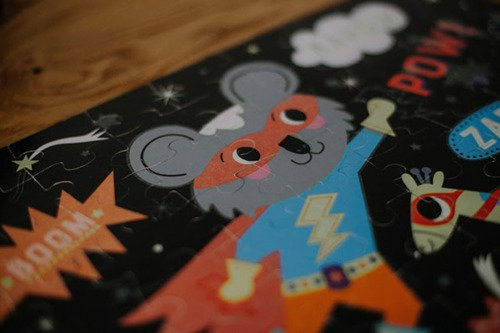 Puzzle świecące w ciemności Superbohaterowie amerykańskiej marki MUDPUPPY nadają układaniu puzzli nowy wymiar – na samym złożeniu obrazka zabawa się bowiem nie kończy. Układanka składa się ze 100 elementów, po ułożeniu przedstawiających bohaterskiego koalę, żyrafę i królika w pelerynach i maskach, czuwających nad miastem. To jednak nie wszystko. Kiedy robi się ciemno, zarówno bohaterowie, jak i otaczający je krajobraz... świecą, a na obrazku dodatkowo pojawiają się, wcześniej niewidoczne, nowe postacie i elementy! Puzzle te to niebanalny pomysł na rodzinną rozrywkę. Zaciekawią i zachwycą wszystkich.
