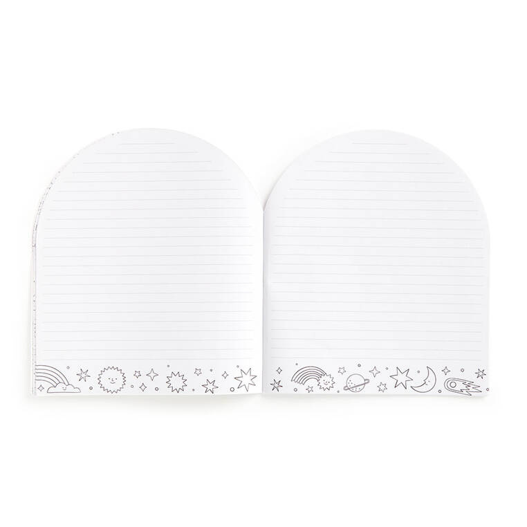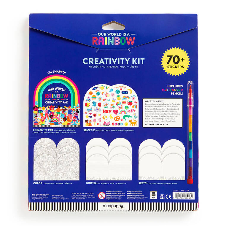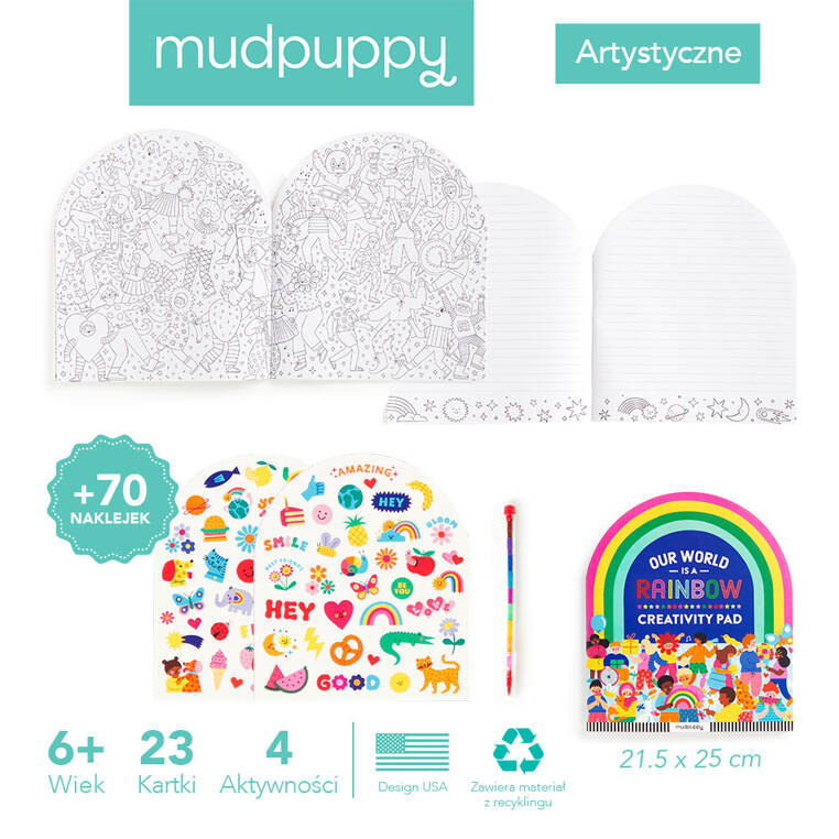 Zestaw kreatywny Tęczowy świat amerykańskiej marki MUDPUPPY to angażująca, rozwijająca i uspokajająca zabawka dla dzieci. W zestawie znajduje się blok kreatywny w kształcie tęczy z czterema rodzajami stron: białymi, w linię, w kropki oraz z ilustracjami do kolorowania. Do zestawu dołączono także dwa arkusze z ponad 70 naklejkami oraz wielobarwną kredkę ze zmiennymi rysikami.