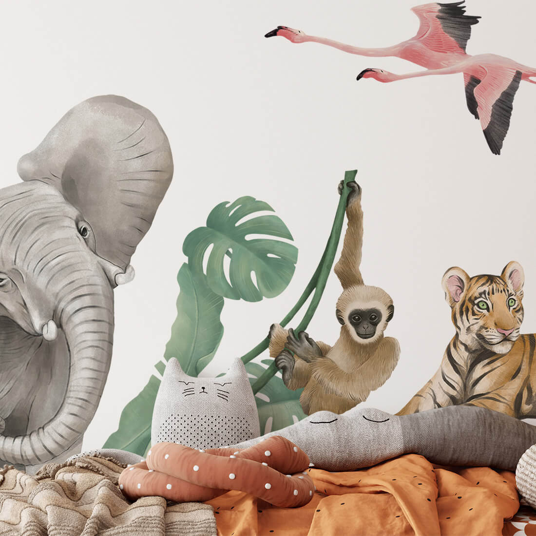 W skład zestawu wchodzą: słoń, tygrys, flamingi, małpa, liście, monstera duża, monstera mała. Dokładne wymiary podane na ostatnim zdjęciu.