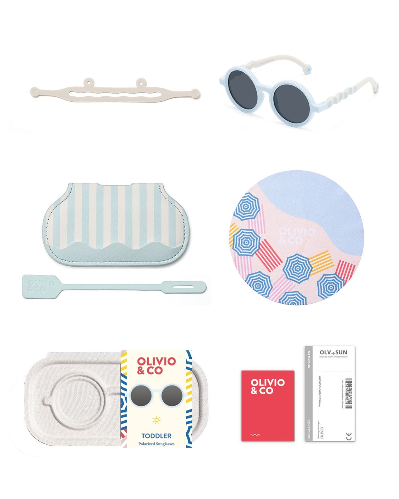 Okulary przeciwsłoneczne OLIVIO&CO, zamszowy futerał z paskiem do torby, silikonowy pasek na głowę dziecka, ściereczka do czyszczenia oraz ekologiczne etui z trzciny cukrowej.