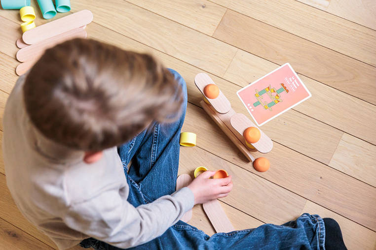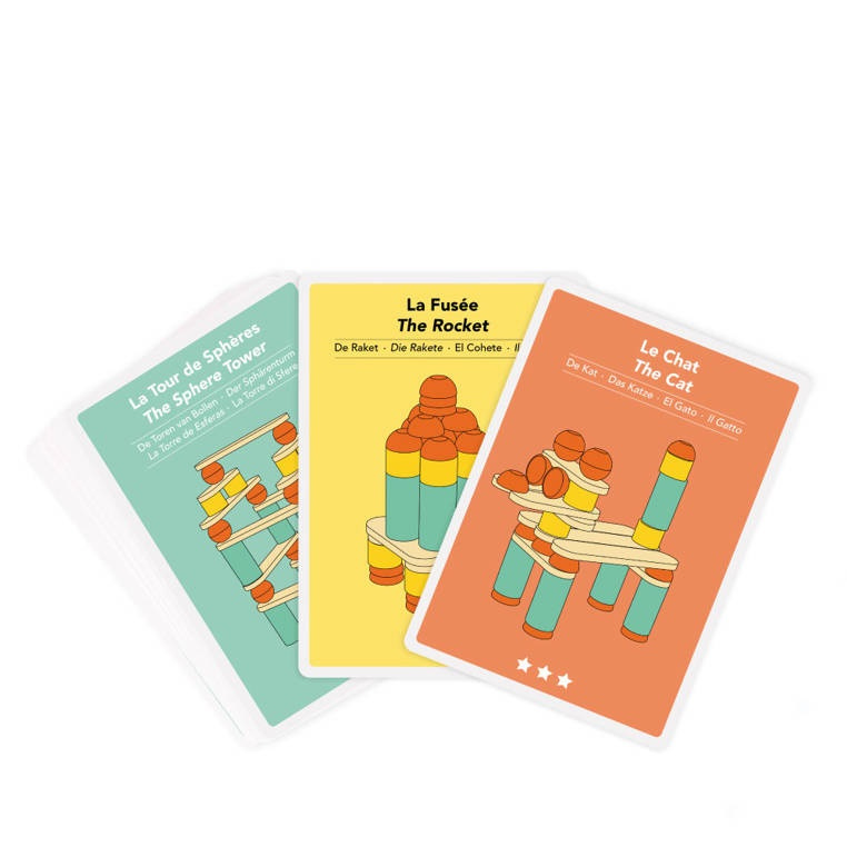 Wśród modeli do zbudowania znajdują się m.in. wysokie wieże, pojazdy czy zwierzęta. Dzieci mogą korzystać z ilustracji lub, w razie potrzeby, skorzystać z instrukcji zamieszczonej na odwrocie karty. Karty są dwujęzyczne – zawierają opisy w języku francuskim i angielskim. Są również laminowane, co zapewnia ich trwałość i odporność na zabrudzenia, a także umożliwia łatwe czyszczenie.