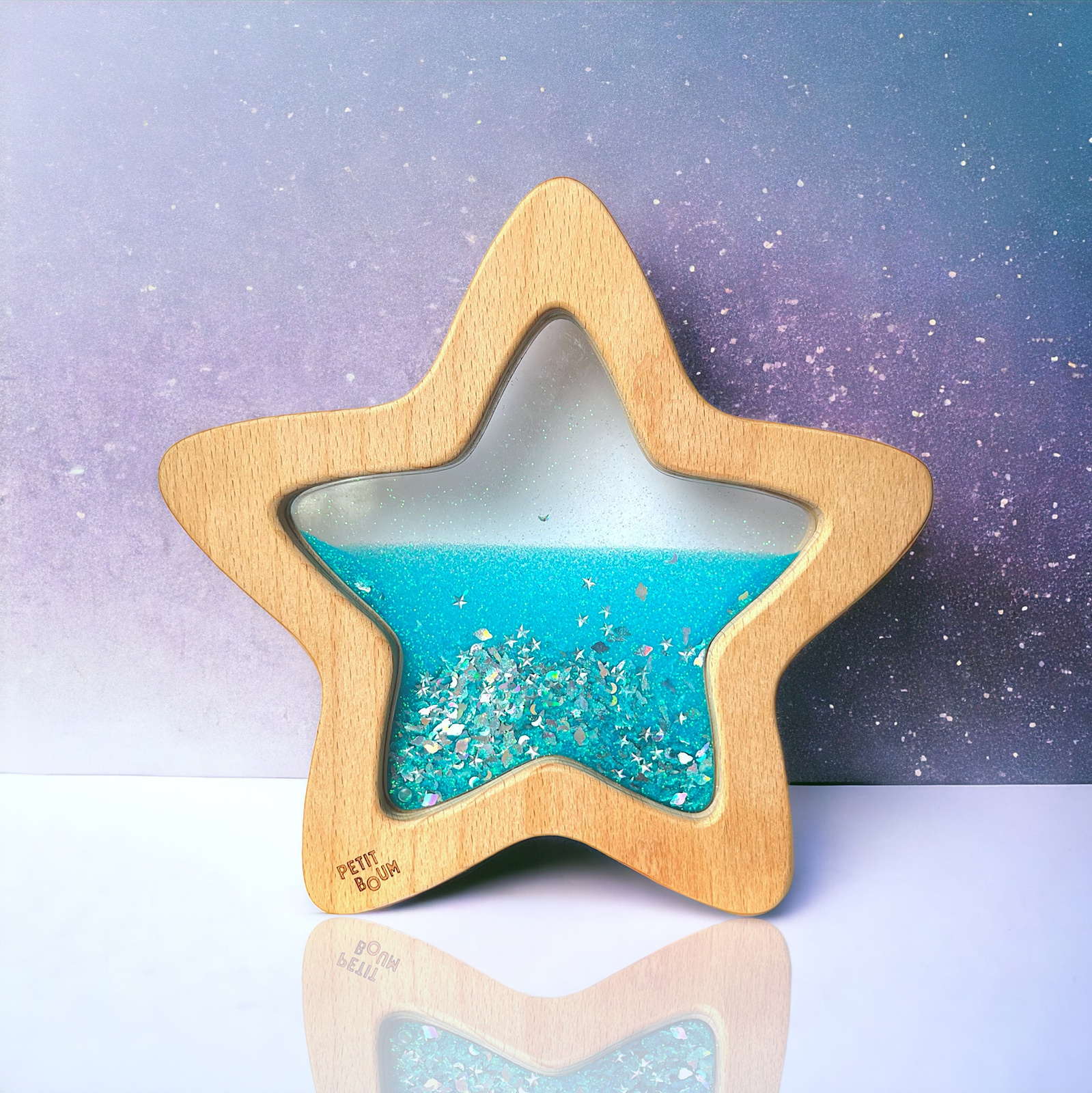 Wyjątkowo duża, bo aż 19 cm gwiazda została stworzona ręcznie w Hiszpanii. Całość wykończono starannie wyszlifowanym drewnem, co nie tylko zwiększa walory estetyczne produktu i pozytywnie wpływa na trwałość zabawki, ale także sprawia, że produkt jest niezwykle przyjemny w dotyku. Gwiazda przepływowa to piękna mieszanka brokatu i piasku fluorescencyjnego, które połyskują w połączeniu ze światłem. Spróbuj naświetlić gwiazdę, a odkryjesz niewidoczne wcześniej gwiazdki fluorescencyjne wirujące w brokatowym płynie. To zdecydowanie efekt WOW, który zachwyci dzieci i rodziców!