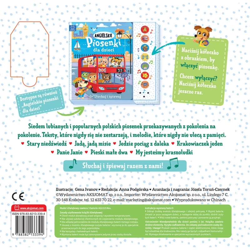 - Książeczka z polskimi piosenkami dla dzieci – słuchaj i śpiewaj! Klasyczne melodie, kolorowe ilustracje i nauka przez zabawę.
