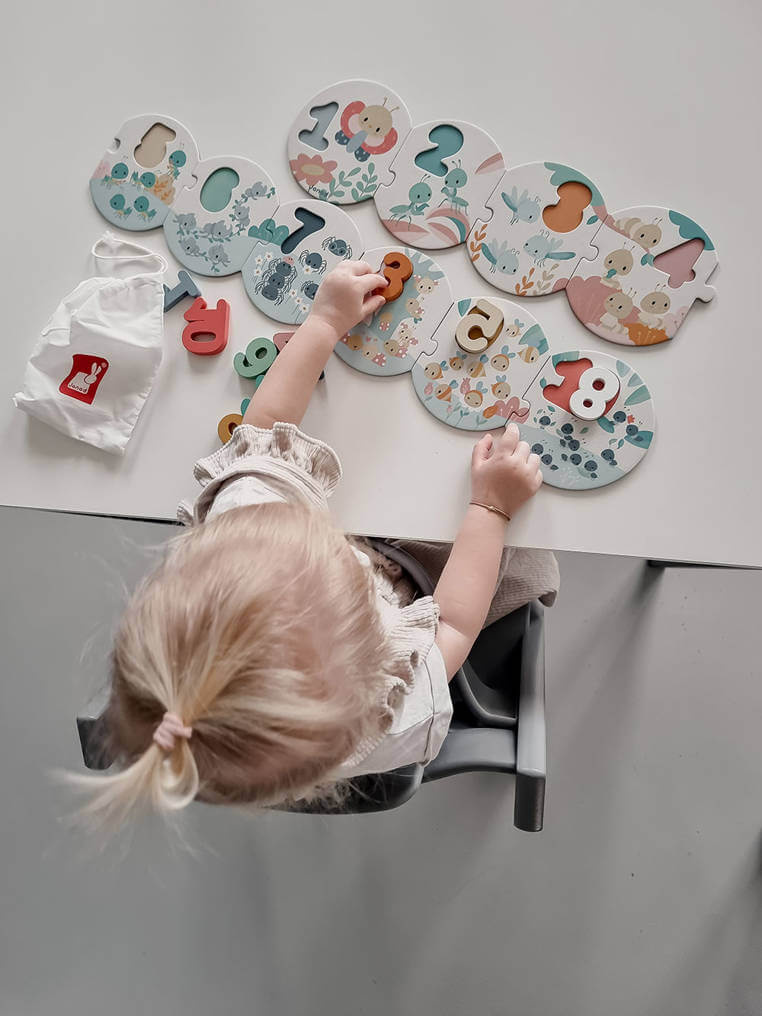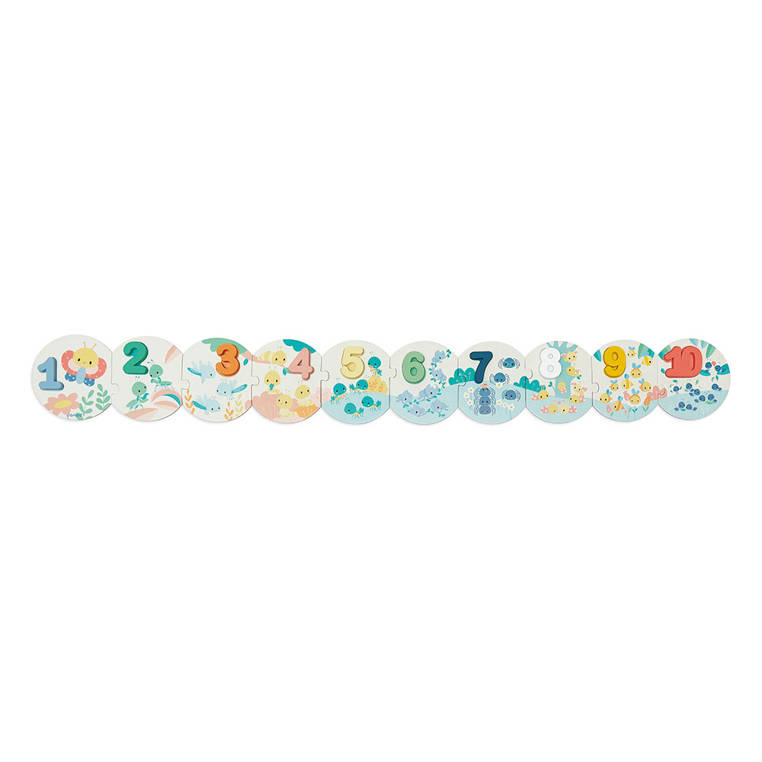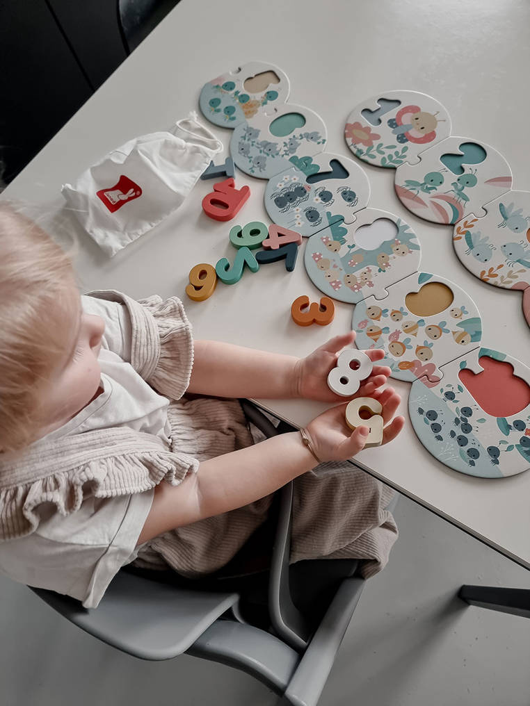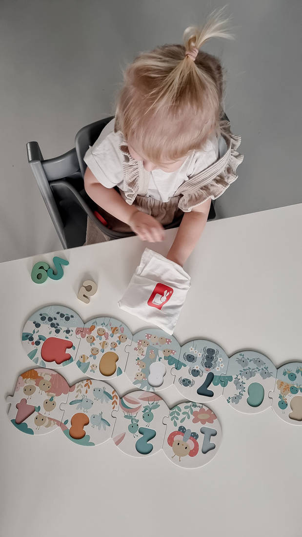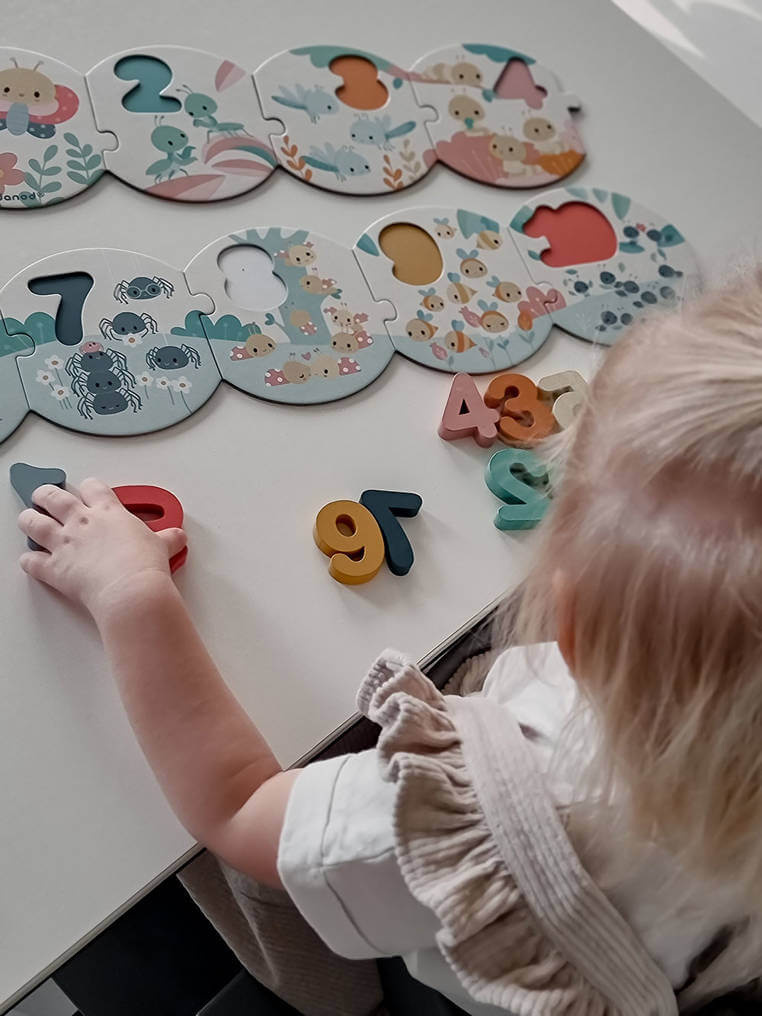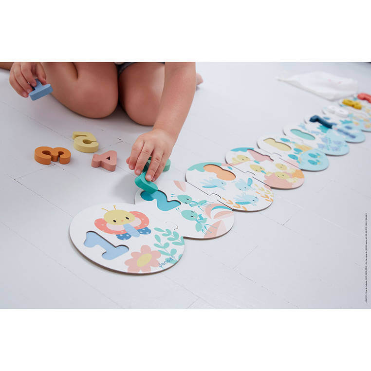 Puzzle z drewnianymi cyframi z serii Pure francuskiej marki JANOD to duża (bo ponad metrowa) układanka, która pomoże dziecku w przyswojeniu sobie umiejętności liczenia i rozpoznawania cyfr od 1 do 10. Składa się z 20 elementów: 10 okrągłych puzzli z kartonu, które należy połączyć ze sobą we właściwej kolejności oraz 10 drewnianych przestrzennych cyfr – do umieszczenia w odpowiednich miejscach na tych puzzlach jako planszach. Na planszach, utrzymanych w pastelowej kolorystyce znajdują się ponadto urocze ilustracje owadów (m. in. świerszczy, mrówek, pajączków czy biedronek) w liczbie, odpowiadającej tej, którą należy na danym elemencie umieścić. Spore rozmiary i proste kształty pozwalają na łatwe łączenie elementów. Do zestawu dołączony jest poręczny woreczek, ściągany sznurkiem, do przechowywania układanki.