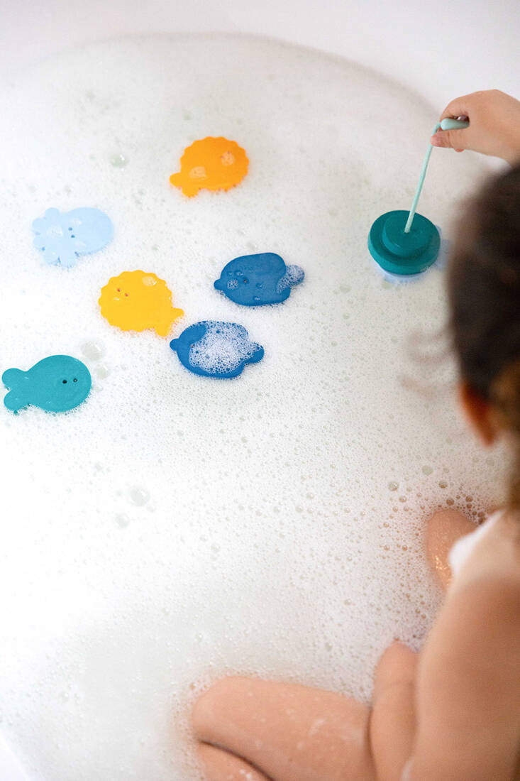 Zestaw składa się z 9 elementów – 8 naklejek w kształcie morskich stworzeń oraz wędki z silikonową rączką, sznurkiem i krążkiem z pianki. Naklejki przyklejają się po zamoczeniu do powierzchni wanny lub glazury, a unosząc się na wodzie, mogą być wyławiane za pomocą wędki. Dziecko początkowo bawi się naklejaniem (od ok. 10 m+), a później może ćwiczyć zręczność w łowieniu (od ok. 18 m+).