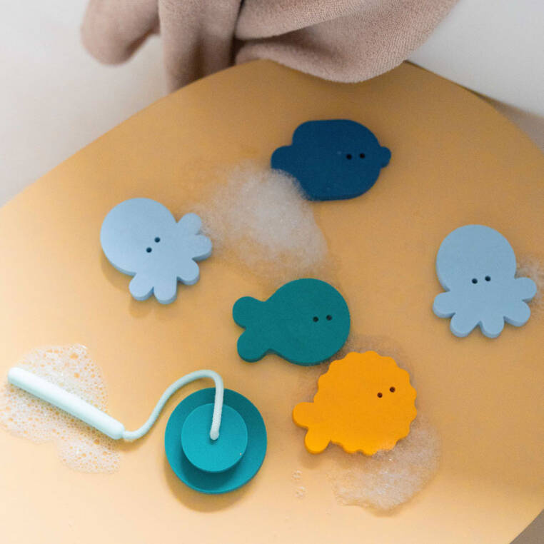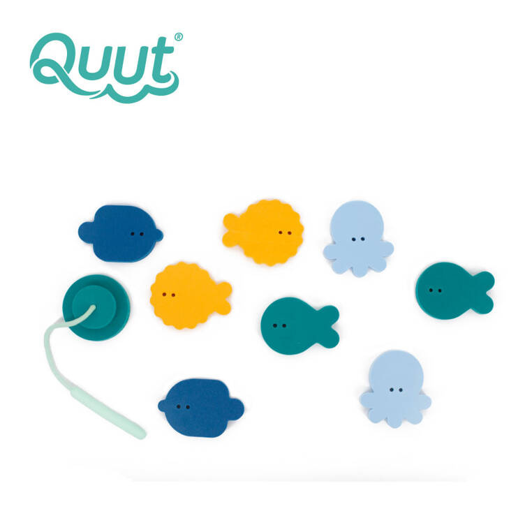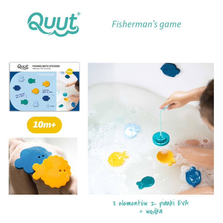 - Quut Deep Sea – 9-elementowy zestaw piankowych naklejek z wędką do kąpieli. Rozwija motorykę, kreatywność i koordynację ręka-oko.