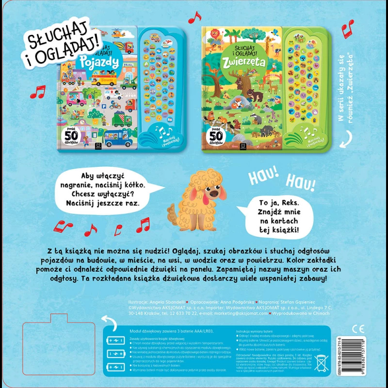 Książka posiada znak CE i spełnia europejskie normy bezpieczeństwa. Zawiera drobne elementy – przeznaczona do zabawy pod nadzorem osoby dorosłej. Moduł dźwiękowy zasilany 3 bateriami AAA/LR03, które można bezpiecznie wymienić zgodnie z instrukcją producenta.