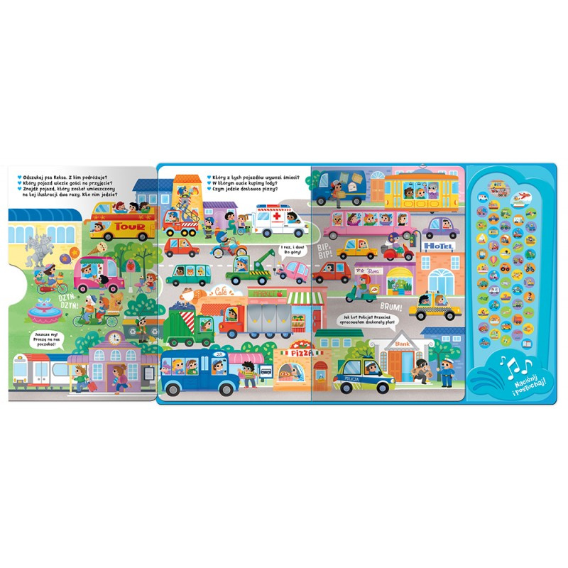 Książka posiada aż 52 realistyczne odgłosy pojazdów – od samochodów i pociągów po helikoptery i statki.