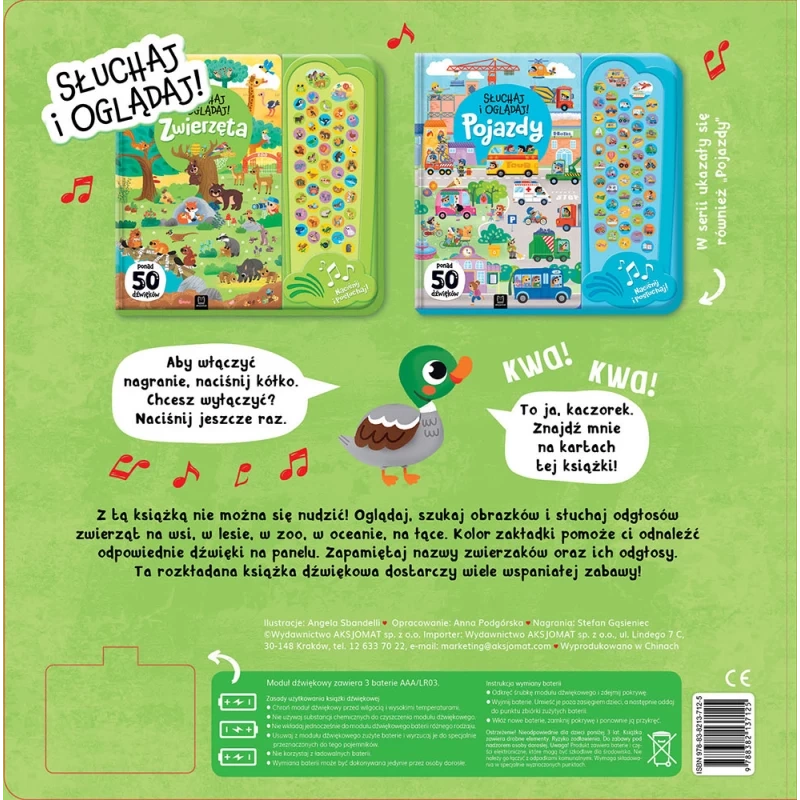 Słuchaj i oglądaj! Zwierzęta 3+ to niezwykła książka dźwiękowa dla małych odkrywców przyrody. Znajduje się w niej ponad 50 realistycznych odgłosów zwierząt oraz pięć bogato ilustrowanych rozkładówek z różnymi środowiskami: na wsi, w lesie, na łące, w zoo i pod wodą. Dziecko uczy się nazw zwierząt, poznaje ich wygląd, miejsca życia i charakterystyczne dźwięki – przez zabawę i aktywne słuchanie.