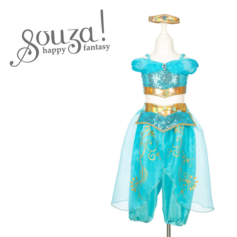 Kostium arabska księżniczka Amira marki Souza! to efektowny strój orientalny dla dziewczynki, inspirowany bajkowym stylem Bliskiego Wschodu. Zestaw składa się z połyskującego topu, wygodnych spodni-alladynek z delikatnym tiulem oraz złotej opaski na czoło z regulacją. Całość utrzymana jest w odcieniach błękitu i złota, ozdobiona cekinami i dekoracyjnymi „kamieniami”, dzięki czemu kostium pięknie mieni się podczas ruchu.