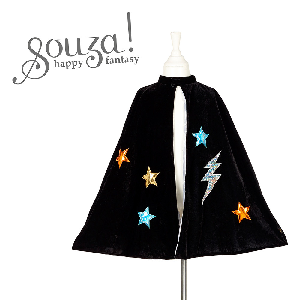- Souza! Czarna peleryna superbohatera z weluru z holograficznymi gwiazdami i księżycem. Strój dla dzieci 4–8 lat. Idealny na bal przebierańców i prezent.