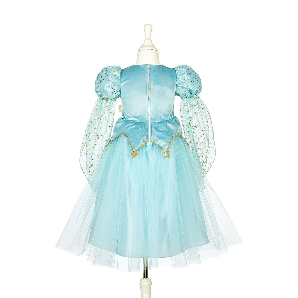 - Bajkowy wygląd – złote aplikacje i błękitny kolor sprawiają, że sukienka wygląda jak z baśni.
