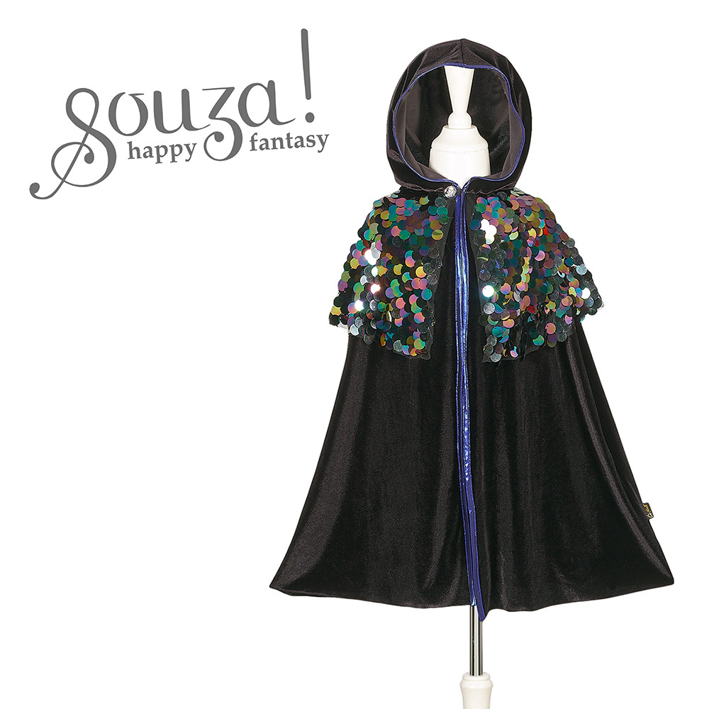 Souza! Kostium – Peleryna czarna z kapturem i cekinową narzutką Bella to wyjątkowe przebranie, które pozwala każdej dziewczynce poczuć się jak księżniczka, wróżka lub tajemnicza postać z bajki. Peleryna wykonana jest z miękkiego czarnego aksamitu i ma dodatkową, krótszą warstwę z dużych, połyskujących cekinów w kolorach tęczy. Ozdobiona jest metaliczną, ciemnoniebieską lamówką wokół kaptura i zapięciem na guziczek z kryształkiem. Dzięki lekkiej konstrukcji i miękkiemu materiałowi jest komfortowa w noszeniu. To doskonały wybór na Halloween, bale przebierańców, Sylwestra czy urodziny w magicznym stylu. Świetnie sprawdzi się również jako prezent dla dziecka.