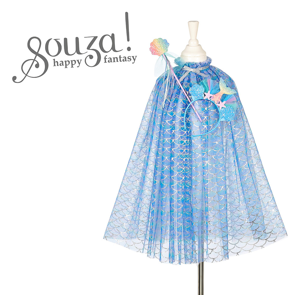 Souza! Kostium – Peleryna z opaską do włosów i różdżką Syrenka Marlya to magiczny zestaw dla dziewczynki, który przenosi w podwodny, bajkowy świat. Efektowna peleryna wykonana jest z niebieskiego tiulu, ozdobionego połyskującym nadrukiem imitującym syrenie łuski. Obszyta jest srebrzącą się tasiemką, a stojący kołnierzyk zapinany jest pod szyją na nap. W komplecie znajdują się dwie piękne ozdoby: lekka opaska z aplikacjami muszli, gwiazdek i syreniego ogona oraz różdżka z brokatową muszlą i tiulowym upięciem. Zestaw świetnie sprawdzi się jako samodzielny kostium na Halloween, bale przebierańców czy tematyczne przyjęcia, a także jako prezent dla dziewczynki.