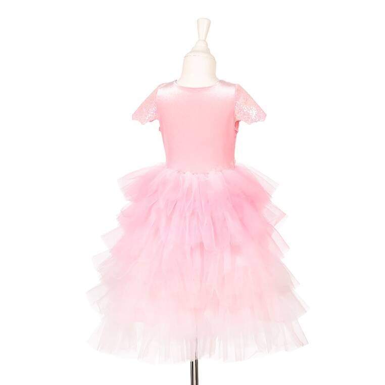 Góra sukienki zachwyca dwustronnym wykończeniem: z przodu pokryta jest drobnymi, różowymi cekinami (również na rękawkach), a z tyłu wykonana z miękkiego aksamitu. Dół tworzy wielowarstwowa tiulowa spódniczka z falbanami, która pięknie układa się w ruchu. Całość dopełnia delikatny, różowy kwiat umieszczony w talii.