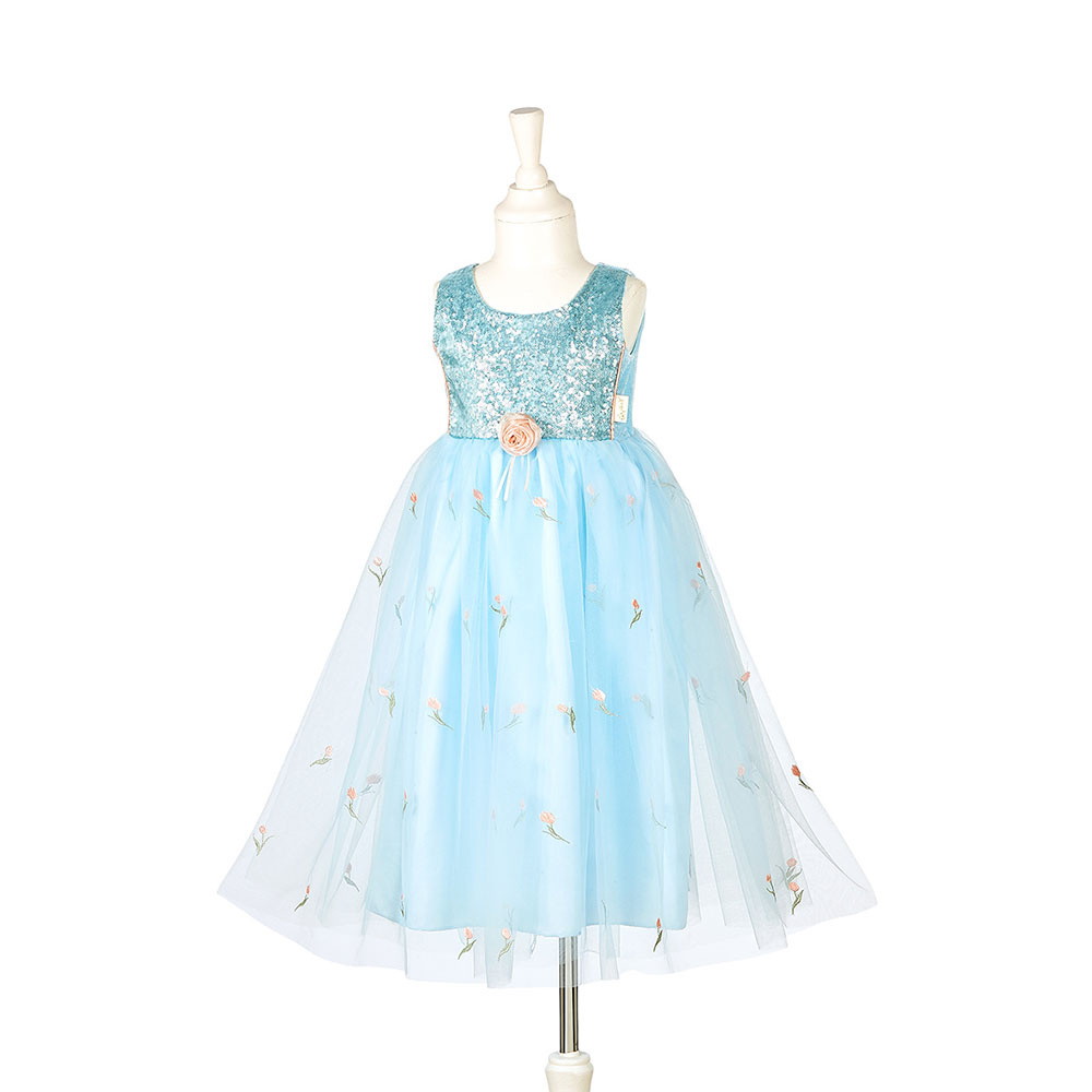 - Souza! Sukienka wizytowa Nicolette – jasnoniebieska z cekinami, aksamitem i tiulem z haftowanymi kwiatami. Dla dziewczynki 5–7 lat. Idealna na bale i prezent.
