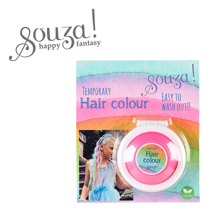 Kreda do włosów dla dzieci holenderskiej marki Souza! w pięknym różowym kolorze. Wykonana na bazie naturalnych minerałów, fakturą przypomina cień do powiek. Przetestowana dermatologicznie, w pełni bezpieczna, nie uczula, nie podrażnia i nie wysusza skóry głowy. Łatwo zmywalna ciepłą wodą z szamponem. Idealna na przyjęcia, urodzinki, zabawę w salon kosmetyczny oraz jako stylowy prezent.